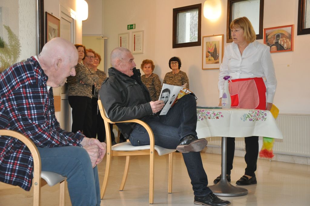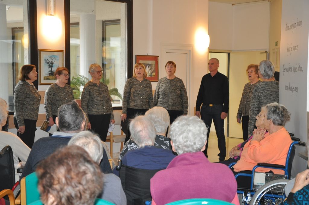 Za 8. marec so nas obiskali prijatelji iz Društva upokojencev Ajdovščina. Pevsko dramska skupina Zarja nas je obogatila s petjem, nasmejala pa s hudomušnim skečem. Vedno znova se vsi začudimo, kakšno moč ima domača pesem. Tudi če je bila zapeta in slišana tisočkrat. Zna pobožati in najbolj bolnemu človeku prinesti tolažbo, tistemu, ki molči že mnogo let, izvabi na ustnice tihe besede, ki dobijo zven. Solza pa privabi spomine na mlade dni, ki pobožajo.