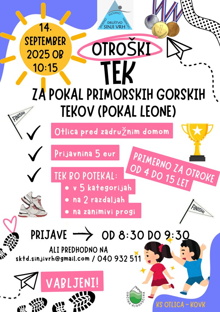 Le teden dni zatem, v nedeljo, 14. septembra, pa vabljeni še na otroški tek, ki bo potekal v okviru prvega Trail teka Angelska gora. Tek je del Pokala primorskih tekov, zato se veselimo številčne udeležbe mladih tekačev, ki bodo v naravnem okolju pokazali svojo vztrajnost in športni duh. Najmlajšim želimo spodbuditi ljubezen do gibanja in narave – zato vabljeni vsi otroci, starši in navijači! Prijave so možne na dan dogodka od 8.30 do 9.30. ali preko maila sktd.sinjivrh@gmail.com. Start teka pa bo ob 10.15 na Otlici.