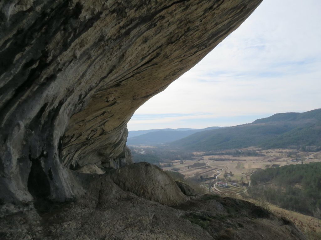 Označena pot nas je vodila po jugu kraškega roba. Od tu smo imeli čudovit razgled na Rakitovec in naselja z železnico visoko pod robom. Na drugo stran je seglo oko do mejnega prehoda Sočerga in po celi dolini, kamor še ni segla pomlad.
