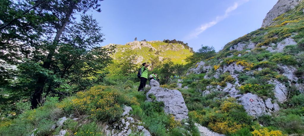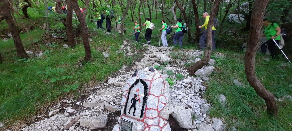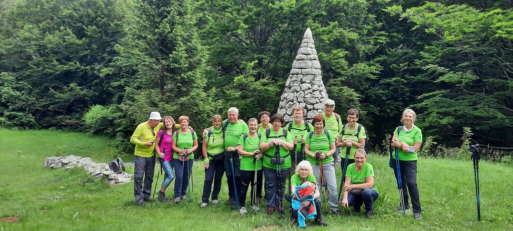 V jami pod vrhom so nas rumeno obarvane zvezde spomnile na božične čase. Tudi sonce nas je sramežljivo pobožalo med vzpenjanjem po zadnjih ovinkih pod kapelico, ki jo varujejo sloki borovci. Tu smo se ustavili, občudovali cvetoče košeničice, ki so rumenele med travami na pobočju. Previdno smo sledili stezi in skozi naravno okno, skalno odprtino, pokukali na vasi v naši lepi dolini. Blizu te naravne znamenitosti je umetno postavljena spirituala, polž je preveč profana beseda za ta unikatno stvaritev navdušenega mladega arhitekta in prostovoljcev, ki so neutrudno zlagali kamenja in obujali tradicijo čiščenja travnikov in gradnje suhih zidov na Gori. Na klopcah smo se odpočili, pomalicali in se fotografirali. Nato smo sledili poti pod Otliškim Majem in opazovali cvetoče šipkove grme. Še rahel vzpon nas je čakal, nato pa razpotje, mimo stare kapelice, do razglednega balkona in po „Benečiji“ v dolino. Zelo hiter in preprost opis, hoja pa zelo počasi, saj smo zelo previdno ubirali korake po strmini navzdol. Tokrat so bile pohodne palice dragoceni pripomočki. Nekdo je prijazno označil številne zavoje poti; brez štetja vemo, da smo prehodili 40 ostrih zavojev in med nadležnimi travami, ki so zakrivale pot, se hitro spustili do poseke nad cesto, ki gre na Predmejo. Nekdaj grda rana v gozdnato pobočje se počasi celi in zarašča in morda bo čez leta prijetna predsoba čarobnega toploljubnega listnatega gozda nad cesto. Mehka pot med drevjem in spokojnost ter zelenje, ki je skrivalo pogled na temnosive oblake, ki so se, kot na povelje meteorologov, zbirali na vzhodu in zahodu, je pripomoglo, da smo prepustili domišljiji prosto pot v nevidne razsežnosti, govornim organom dovolj telovadbe; torej poskrbeli za duše in srca. Pregledali smo tudi tablo s kolesarskimi potmi, ki so jo nedavno postavili kolesarji in v prijetnem razpoloženju vrnili do avtomobilov. Mirkovo znanje in izkušnje gorskega vodnika sta veliko pripomogla, da smo v dopoldnevu premagali 500 višinskih metrov