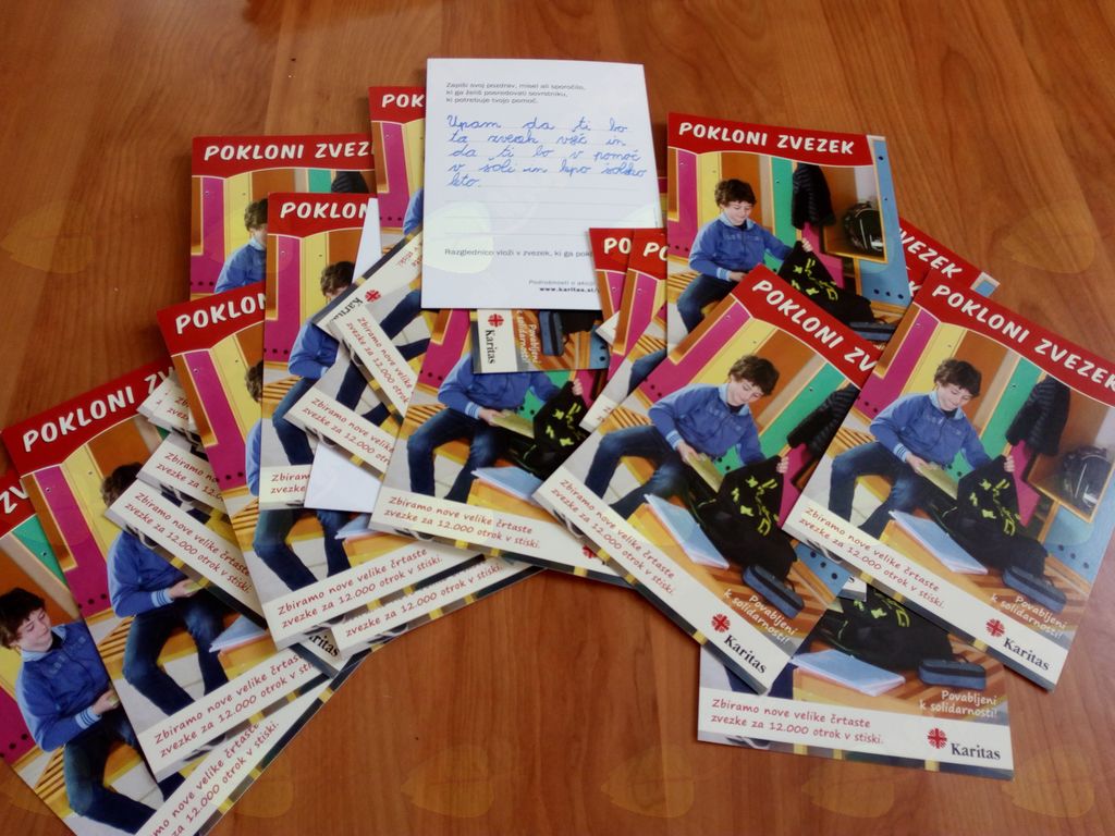 Med nami so družine, ki se iz različnih vzrokov pred začetkom šolskega leta znajdejo v stiski. Pri Karitas ne čakamo, da se bo to zgodilo prvi šolski dan, temveč že v začetku junija začnemo z zbiranjem in razdeljevanjem šolskih potrebščini. K pomoči smo povabljeni vsi, še posebej pa z akcijo Pokloni zvezek nagovarjamo vrtce in šole. Namen tega ni le zbiranje, temveč povabilo otrokom in mladim k čutenju s sovrstniki, posledično pa k solidarnosti. Večina vrtcev ter matičnih in podružničnih šol v občini Ajdovščina in Vipava je že v preteklih letih sodelovala v projektu Pokloni zvezek in dopisnice s sporočili, kjer so otroci neznanemu prijatelju napisali dobro misel, so pravi biseri dobrodelnosti. Morda samo ena zgodba, ki nagovarja otroke širom Slovenije, dogaja pa se prav pri nas: