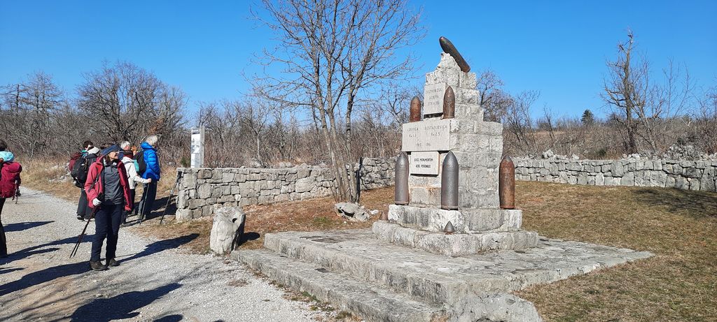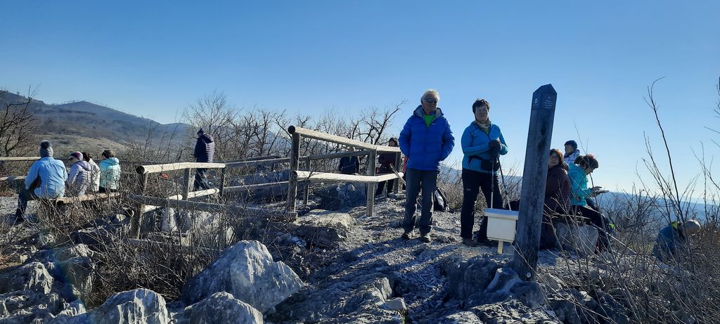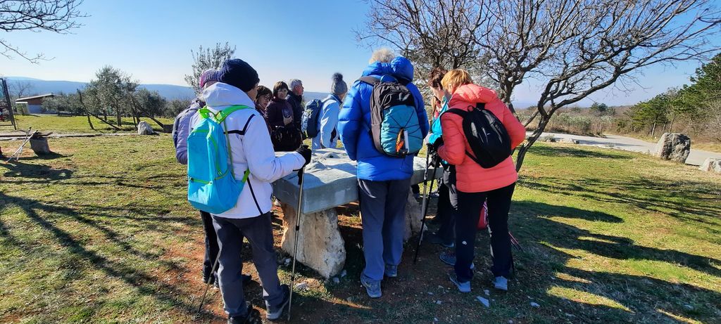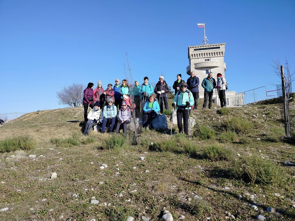 Umaknili smo se mrzlemu jutru in ajdovski burji. Na četrtkov pohod smo se odpeljali pod Cerje. Parkirali smo pri informativni tabli Vrh Drage, ob cesti, ki vodi proti Mirnu. Pot smo začeli po cesti, ki se je spremenila v stezo po dolini Srčandol, med ostanki pogorelih dreves na razgledni vrh na robu kraške planote, Cerje. Tu stoji 25 metrov visoka zgradba v obliki obrambnega stolpa, ki simbolizira obrambo slovenskega naroda skozi različna zgodovinska obdobja – Pomnik miru. S Cerja so bili lepi razgledi na zasnežene Julijske Alpe, Jadransko morje, Furlansko nižino in Vipavsko dolino. Za spomin še skupinska fotografija s stolpom v ozadju. Po cesti smo se spustili proti jugu, kjer nas je oznaka usmerila na stezo proti jami Pečinki in na 308 metrov visoko vzpetino Pečina. Na vrhu Pečine je bila vojaška opazovalnica. Italijanski vojaki so jo imenovali oko Krasa, na to nas je opozoril napis na tabli (oko Krasa). Res so od tod lepi razgledi na vse strani. Vidno ohranjeni so strelski jarki. Po krajšem počitku in malici smo se spustili do jame Pečinka. Jama je naravnega izvora z umetno izkopanim rovom do vrha Pečine. V I. svetovni vojni je služila kot vojaško zavetišče. Pomembna je tudi iz arheološkega vidika, v njej so izkopali prazgodovinske lončevine in človeške kosti. Od jame smo se po stopnicah povzpeli v strelski jarek, ki vodi do ceste in do spomenika - kažipota, postavljenega v čast poveljniku avstro-ogrskega korpusa nadvojvodi Jožefu. Poleg je še Borojevićev prestol (kamniti stol), ki je dobil ime po poveljniku avstro-ogrske armade Svetozarju Borojeviću. Pohod smo nadaljevali po makadamu, mimo številnih oljčnih nasadov, proti vasi Lokvica. Pred vasjo smo si na veliki kamniti podlagi ogledali relief Krasa. Neopažena ni ostala niti pogorela kraška pokrajina. Kmalu smo zavili na stezo skozi kraški gozd, mimo topniških položajev, do cilja. Vrnili smo se v topel sončen dan, polni novih spominov za dušo in srce.