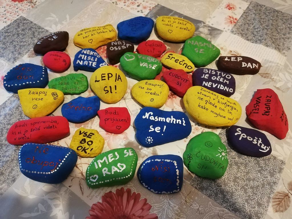 Tudi v Hiši Malorca Ajdovščina spodbujamo naše stanovalce k prijaznosti. V ta namen smo barvali kamenčke, na katere smo napisali lepe misli. Nekaj jih lahko najdete na vhodu v vrt pred našo hišo.
