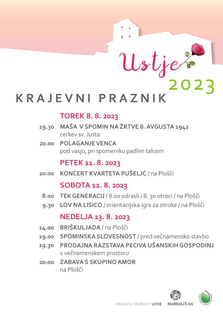 Krajevni praznik Ustje je kot vsako leto posvečen obeleževanju požiga vasi, 8. avgusta 1942. Z organizacijo prireditev v avgustu, KS Ustje ter društvo Numulit.us, izpolnjujeta obljubo, ki so si jo zadali njihovi predniki ob tem tragičnem dogodku, da bodo skupaj vztrajno gradili novo skupnost in nove medsebojne odnose.