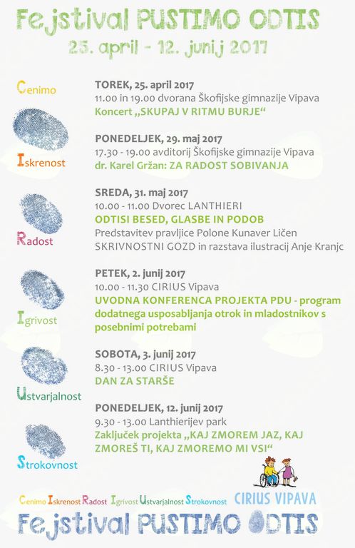 Več kot sto otrok in mladostnikov, ki so zaradi  različnih primanjkljajev v razvoju vključeni v naš center, hrepeni po pestrem dogajanju in doživljanju polnega življenja. Da bi zmogli v čim večji meri uresničiti te svoje želje, jim strokovni delavci nudimo primerno podporo, pomoč in prilagoditve pri učenju, bivanju in razvoju celovite osebnosti. V programih, ki jih v Ciriusu Vipava izvajamo, učencem  prilagajamo tako učne vsebine kot tudi oblike in metode dela, da so le ti v učno vzgojnem procesu kar se da uspešni. Najmlajši se skozi najnežnejša leta pripravljajo na vstop v šolo v prilagojenem predšolskem programu, kjer urijo prve življenjske veščine. Predvsem skozi svet zgodb, igre, glasbe in s sistematičnim opazovanjem okolice, mlajši šolarji v prilagojenem programu z nižjim izobrazbenim standardom spoznavajo prve črke, številke ter naravno in družbeno okolje. Skozi leta postajajo bolj odrasli, zrelejši, samostojnejši. Tako lahko zahtevnejše in kompleksnejše vsebine osvajajo na načine,  ki so primerni njihovi starosti in sposobnostim. Učenje v posebnem programu poteka predvsem na način izkustev. Učenci spoznajo sebe in svet preko vseh svojih senzornih poti. Ne zamujamo priložnosti, ko nam je omogočeno učenje za življenje. Z veseljem čakamo prvih pomladnih cvetlic, si ogledamo domače živali na kmetiji, obiščemo živalski vrt ali se lotimo praznične peke kruha… Preko pomladi smo se udeležili kar nekaj športnih, glasbenih in drugih tekmovanj, s katerih so se otroci vrnili v Center zadovoljni, s pohvalami in priznanji ter bogatejši za nove izkušnje. Nadvse radi se tudi družimo. Med prijatelji se iščejo pogledi, prepletajo dlani in delijo se iskreni objemi. Veseli smo obiskov in trenutkov, ki jih želijo posamezniki ali skupine preživeti v naši družbi. V aprilu smo gostili  nizozemsko glasbeno skupino oseb s posebnimi potrebami in njihovimi spremljevalci De Rolantino's, s katero sta instrumentalna ter plesna skupina Ciriusa z zunanjimi glasbenimi zasedbami kar dvakrat napolnili športno dvorano Škofijske gimnazije Vipava. To je bila pesem pomladi in prijateljstva in prvi dogodek v nizu večih, ki jih napovedujemo v okviru Fejstivala PUSTIMO ODTIS. Tega prirejamo že tretjo pomlad. Z vsebinsko različnimi dogodki se želimo predstaviti domačemu kraju in širši okolici ter tako pustiti odtis, drobno sled v srcih naših otrok, njihovih staršev in vseh, ki se boste našemu vabilu odzvali.