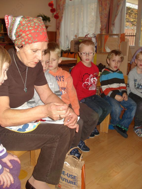 Vsak dan nas je obiskala ročno izdelana lutka 'Babica', ki nam je pripovedovala ljudske pravljice in pela ljudske pesmi. Seznanila nas je tudi s starimi besedami kot so na primer: duri, bajtica, krajcar, kotel, ovace … Ličkali smo tudi koruzo in jo ožurili. Zaželeli smo si izdelati svoj papir, ki je nastal iz starega odpadnega papirja. Ko se je posušil, so nanj risali z ogljem. Nekateri otroci so rekli, da bodo tako tudi pisali sv. Miklavžu. Šli smo si ogledati tudi nekaj starejših hiš.