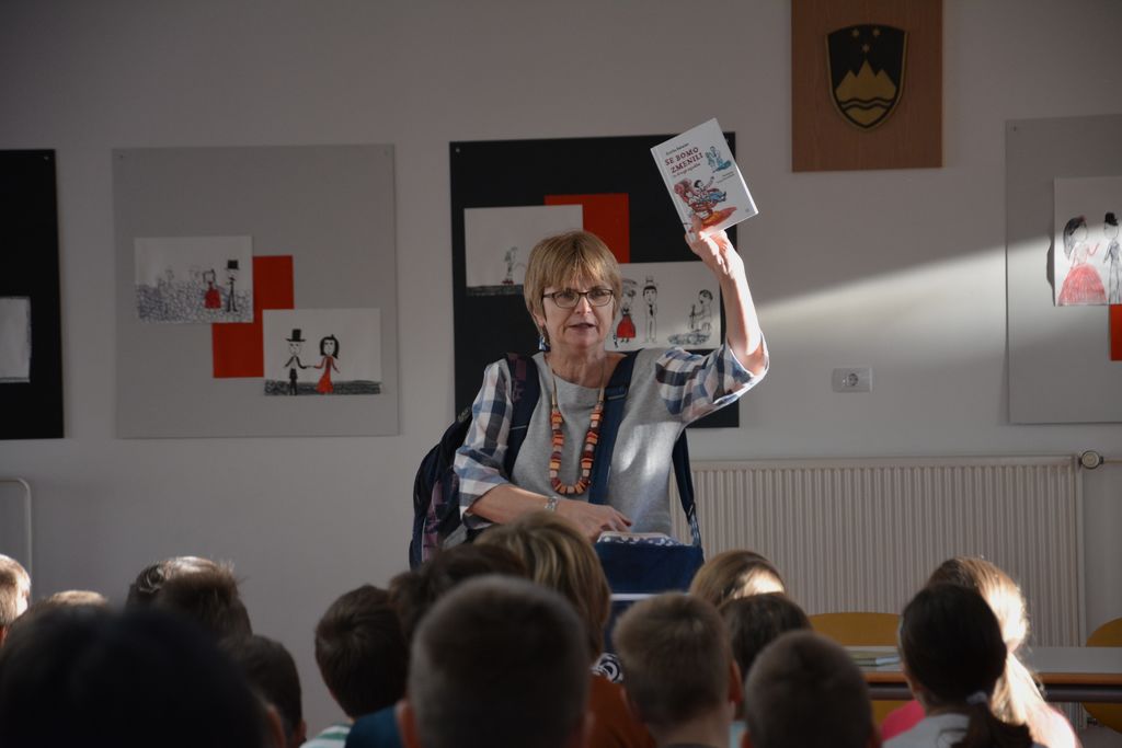 Najmlajšim je v knjižnici pripovedovala pravljice, ki so nastale v projektu Lahkonočnice. Prvo- in drugošolci so slišali zgodbo Modri zajček in Bratec delfin. Malo starejši učenci so prisluhnili zgodbam iz knjig Se bomo že zmenili in druge zgodbe, Moj dojenček ter Kot noč in dan. Učenci 3. triletja so se z ustvarjalko pogovarjali o njenih treh romanih za mladostnike: Kar ne ubije, V napačni zgodbi in Vsak s svojega planeta. Pri tem je pisateljica razložila, kako nastaja roman od prvega osnutka do končne podobe v knjigi. Pripovedovala je, da vedno izbere motiv iz resničnega življenja, da potem piše, napiše do tretjine ali polovice zgodbe, nato pa ponovno bere in izboljšuje.