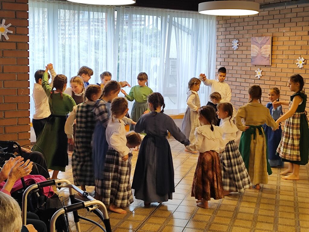 Otroci, ki obiskujejo dejavnost Ljudski plesi, so zaplesali nekaj ljudskih plesov. Učenci dramske skupine pa so v sodelovanju z otroškim pevskim zborom odigrali dramsko igrico Kam bežijo meseci. Ob koncu smo skupaj s starejšimi zapeli pesem Mi se imamo radi.