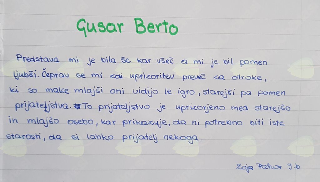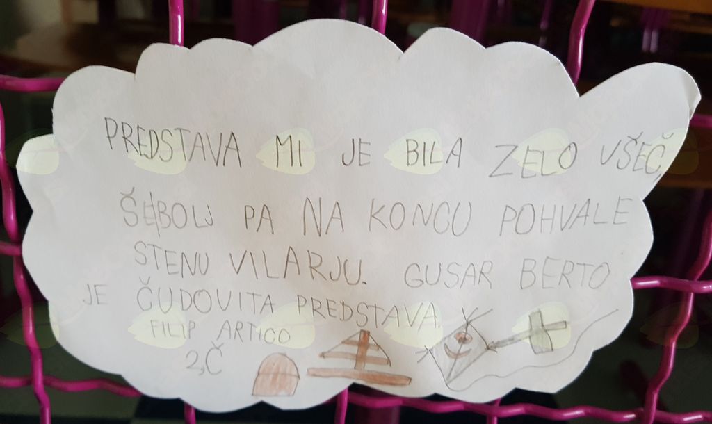 Mogoče se je na trenutke starejšim učencem zazdelo, da so za take zgodbe 'res preveliki', pa vendarle so znali ujeti glavno sporočilo zgodbe: prijateljstvo lahko premaga osamljenost in naredi življenje svetlejše. To smo lahko prebrali tudi v njihovih vtisih, ki so nastali po predstavi in si jih lahko ogledate v priloženih fotografijah.