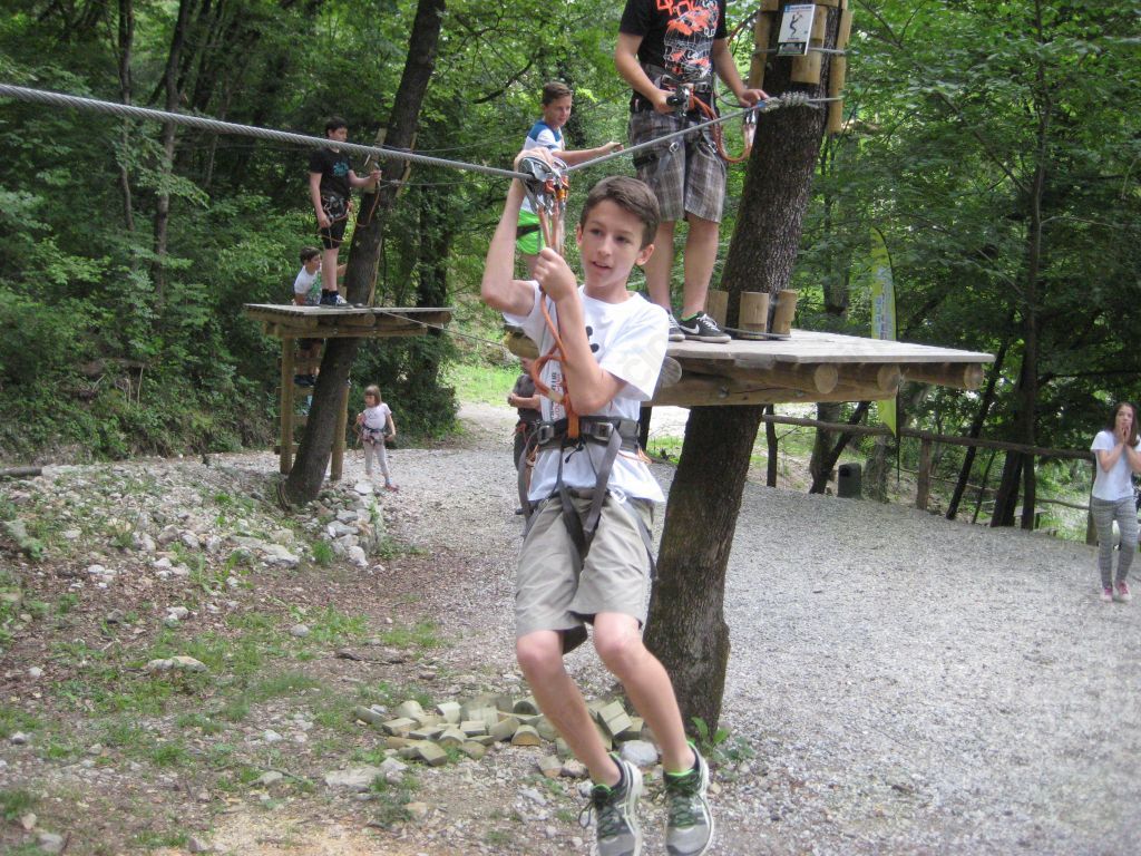 Iz Solkana smo se peš spustili k Soči, kjer so nas z rafti prepeljali čez smaragdno reko do urejenega adrenalinskega parka. Prijazno osebje nam je razložilo in demonstriralo samovarovanje, ki je v parku še kako pomembno. Otroci so se polni adrenalina podali po različnih progah, ki jih park ponuja. V idiličnem okolju je vsak izmed otrok našel pravo mero premagovanja strahu in medsebojnega sodelovanja.