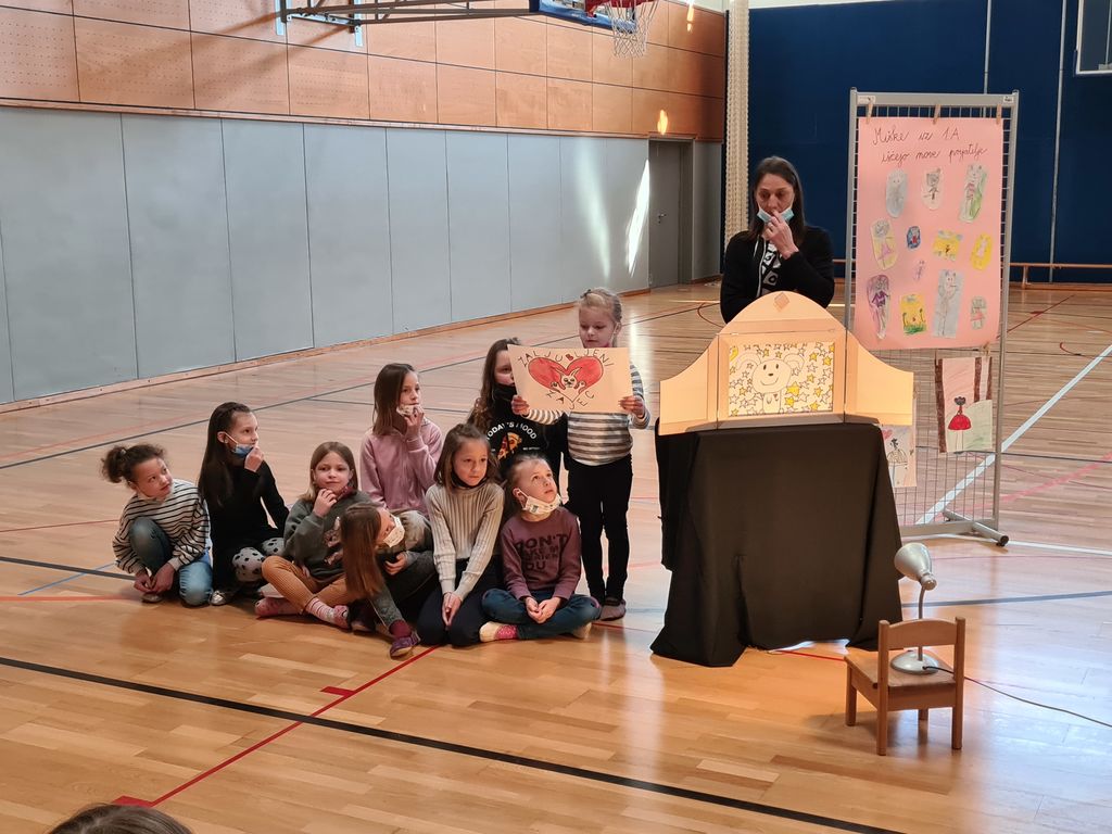 Srečanjesmo pripravili v šolski telovadnici. Pisateljico smo pozdravili tako, da so petošolke po zvočnikuprebrale njeno pravljico Posluh, jazbec gre!, ki nosi v sebi tudi lepo sporočilo »Kdor drugemu jamo koplje, sam vanjo pade.« Pričakala pa jo je tudi razstava likovnih izdelkov naših učencev, tako pred šolsko knjižnico, kot tudi v telovadnici.Prisluhnili smo tudi učencem lutkovnega krožka 2. razreda, ki so nam ob slikah, ki so jih sami narisali, predstavili in pripovedovali pravljico Zaljubljeni zajec.