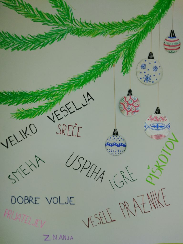 Mislimo drug na drugega in se potrudimo tako, da spečemo kolače ali sladke medenjake, preberemo pravljico, izdelamo adventni venček ali novoletne okraske … Pripravimo ilustracije za posebno gledališče – kamišibaj in predstavimo zgodbo. Izdelali smo si tudi posebne voščilnice v obliki plakata, ki krasijo hodnike in preddverja naših učilnic, delijo lepe misli in želje … za prihajajoče praznike in novo leto.