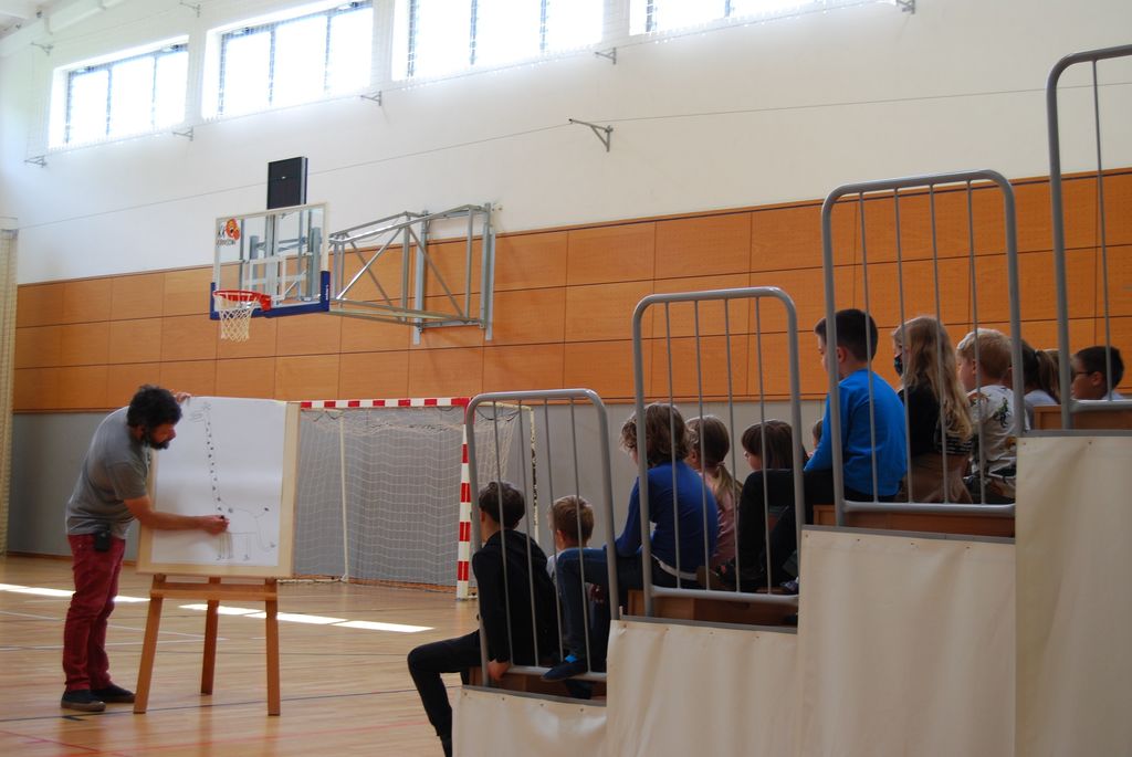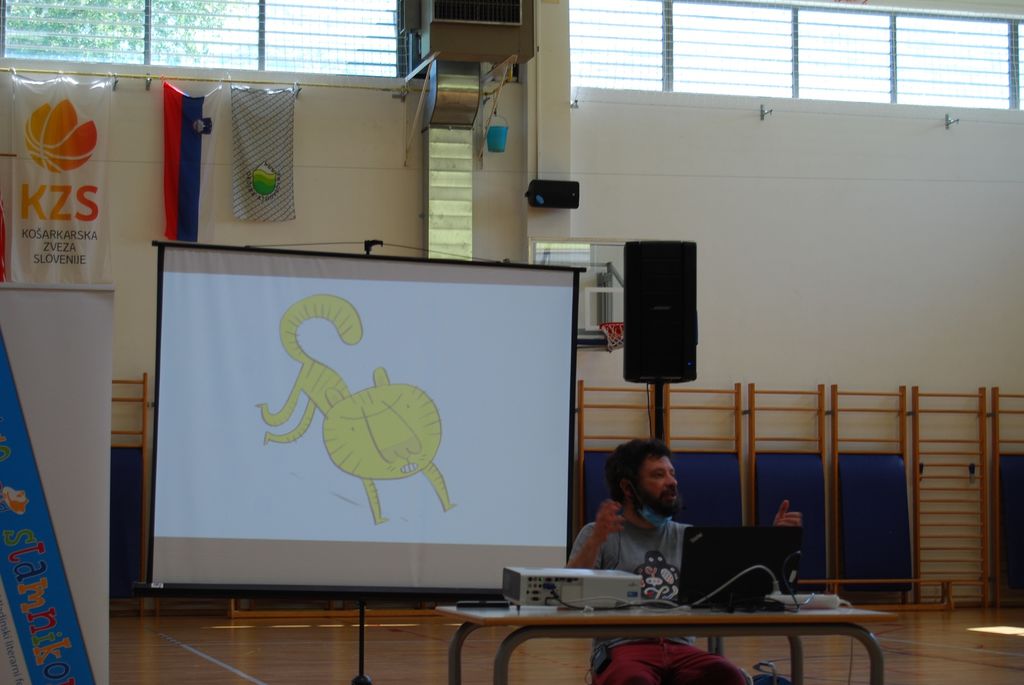 Razložil je, da sam najprej razmisli, kaj je za žival ali osebo najbolj značilno, in to potem tudi nariše. Učencem je pokazal več risb živali in pojasnil, zakaj jih je narisal take.