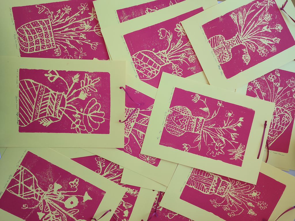 Tretješolci so natisnili grafike (vrez v umetno maso) 'Šopek za mamo' in ga dali na vrvico, da bo kot slika. Zadaj bomo napisali lepe misli o mami.