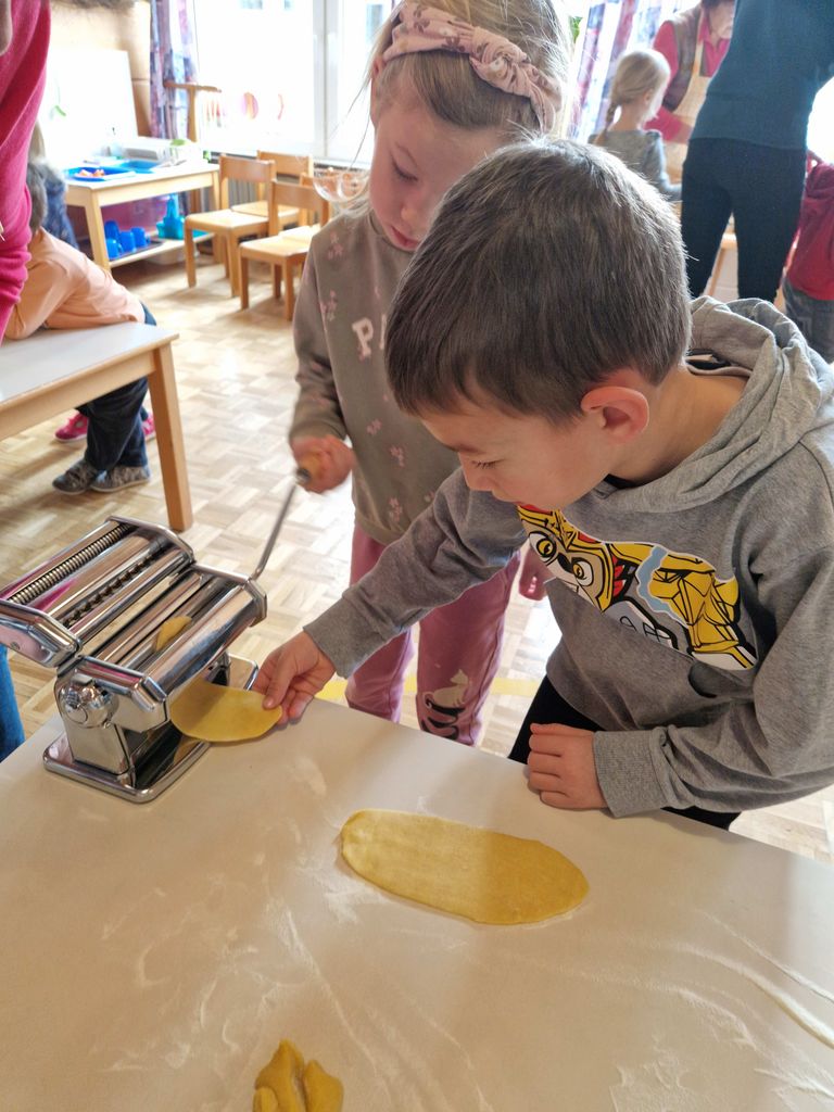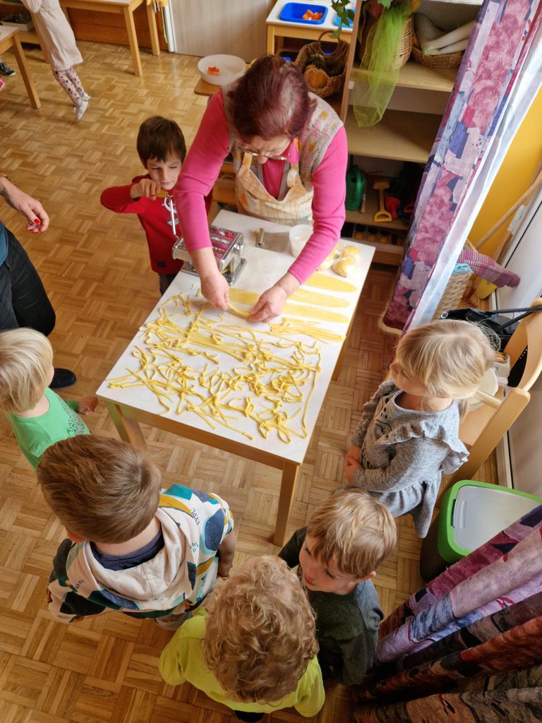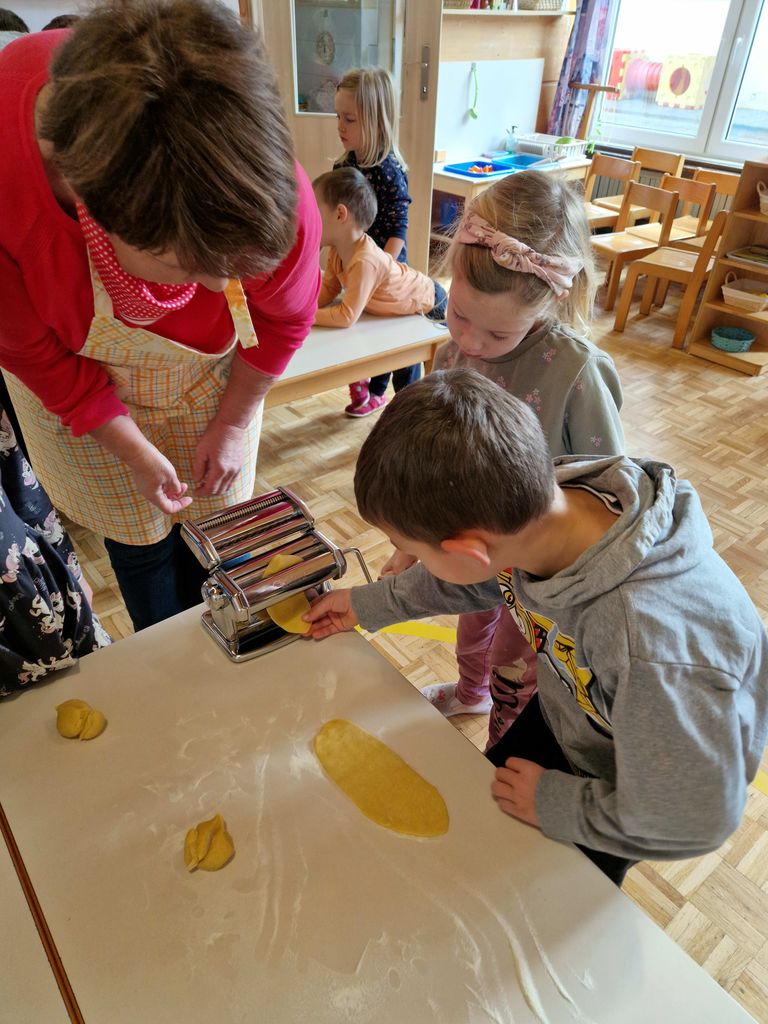 Preden smo začeli z delom, nam je gospa Boža predstavila vse potrebne sestavine za pripravo testenin. Skupaj smo tako zamesili testo, ki je moralo nato pol ure 'počivati'. Testo smo nato valjali s pomočjo posebnih strojčkov za pripravo testenin, kjer je vsak otrok zvaljal svoj košček testa. Iz testa so otroci izdelali široke rezance in tudi rezance za v juho. Pripravili smo tudi okusno paradižnikovo omako, ki smo jo postregli k naši pašti. Otroci so bili skozi celo dopoldne zelo aktivni in so radi pomagali pri vseh dejavnostih. Njihov trud in vztrajnost sta bila poplačana, ko so lahko svoje testenine z omako tudi poskusili. Vsem je bila naša domača 'pašta' boljša kot tista iz trgovine. Iz naših izkušenj otroci tudi veliko raje pojedo jedi, pri katerih so vključeni v pripravo. Naše skupno druženje je bilo prijetno, sproščeno in dragoceno za vse nas. Iskrena hvala vsem gospodinjam za podarjen čas in vsa znanja, s katerimi ste nas obogatile. Veselimo se druženja in sodelovanja tudi naprej.