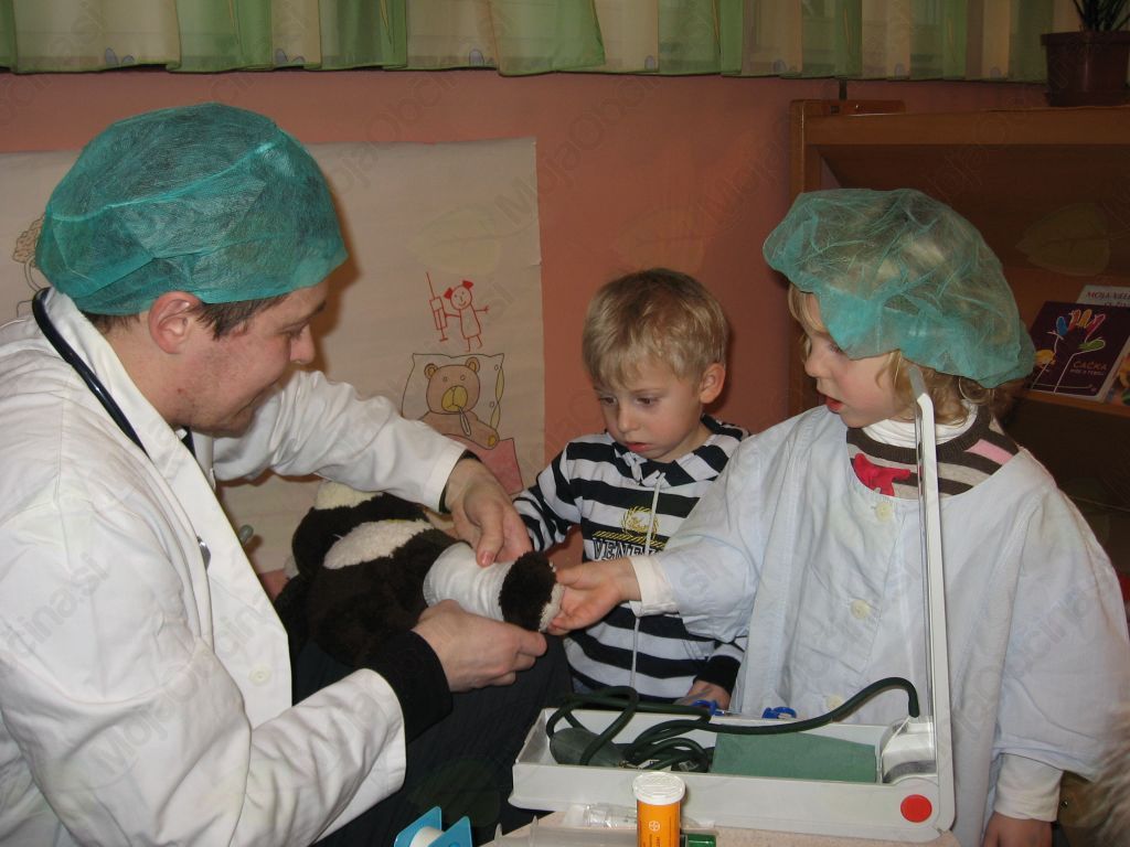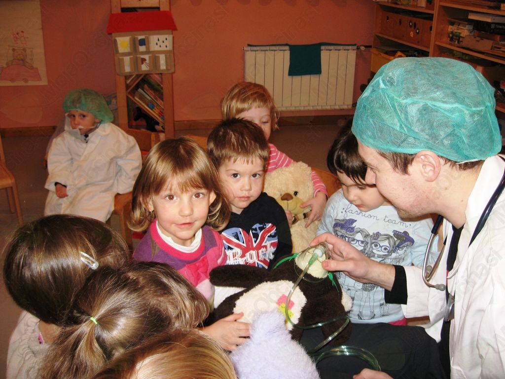 Sneg smo nekajkrat lahko opazovali le od daleč, na Čavnu in Gori. In ob vsem tem, večkrat prav nič zimskem vremenu, smo se redno spopadali z zimskimi prehladi. In tako smo tudi tej temi posvetili nekaj časa. Poslušali smo pravljico 'Dr. Hov', peli pesem o medvedku in pripovedovali deklamacijo o bacilih ter izvedli nekaj poizkusov z bacili. Medse pa smo povabili tudi zdravnika, očeta deklice iz naše skupine. Zelo lepo nam je predstavil svoj poklic, pokazal zanimive pripomočke in se z nami igral. V naši Bolnišnici je ozdravil vse naše medvedke, enega zdravega pa samo pregledal.