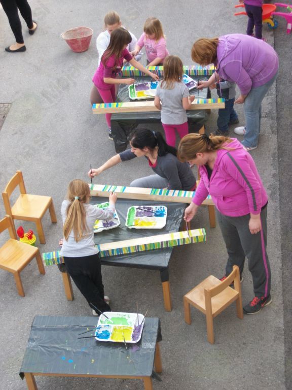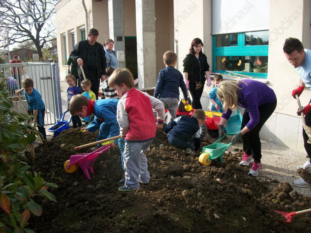 Mesec marec je namreč čas, ko vzgojitelji pripravimo skupno srečanje s starši otrok, ki obiskujejo vrtec Črniče. Tako smo se odločili, da to srečanje izkoristimo in skupaj zberemo ves potreben material in sredstva, s katerimi bomo okolico vrtca uredili do popolnosti. Obenem pa smo ob tej priložnosti, z veliko pomočjo staršev otrok, pričeli s projektom Eko vrt, v katerega je naš vrtec Črniče letos vključen. Vse potrebno je bilo hitro pripravljeno; skupno smo izbrali dan delovne akcije in se tistega sončnega ponedeljkovega popoldneva srečali vzgojitelji, starši in otroci vseh treh skupin našega vrtca. Nekateri so urejali okolico otroških igral, drugi okolico parkirišča, tretji so sadili pomladanske rožice, obrezovali grmičevje in na sveže prebarvali leseno ograjo, ki trenutno predstavlja mejo našega eko vrta Največ 'zagnanih' delavcev pa je vozilo svoje samokolnice polne rodovitne zemlje v gredice, kjer je nastajalo tisto, kar je bilo za otroke najzanimivejše - njihov lastni vrtiček, v katerega smo v naslednjih dneh z otroki posejali več vrst zelenjave. In ni lepšega kot dnevno opazovati nasmejane otroške obraze ob vsaki višji bilki, ki zraste v njihovem vrtičku, saj je le-ta njihov in zanj skrbijo z največjim veseljem.