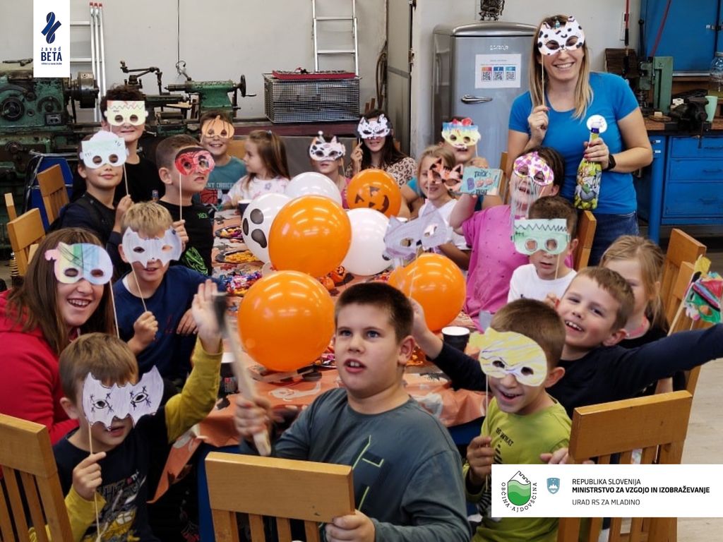 Zadnji dan so otroci izdelovali lesene obeske in maske za noč čarovnic. Iz papirja so nastajale kreativne strašne podobe – od čarovnic in mumij do vampirjev in Frankensteina. Popoldan pa smo se pripravili na zaključni Halloween party! Garaža se je preobrazila v strašljivo prizorišče, okrašeno z barvnimi baloni, svetlobnimi bučkami in prigrizki. Otroci so se zabavali ob barvanju nohtov, družabnih igrah in glasbi, ki je še dodatno popestrila vzdušje.