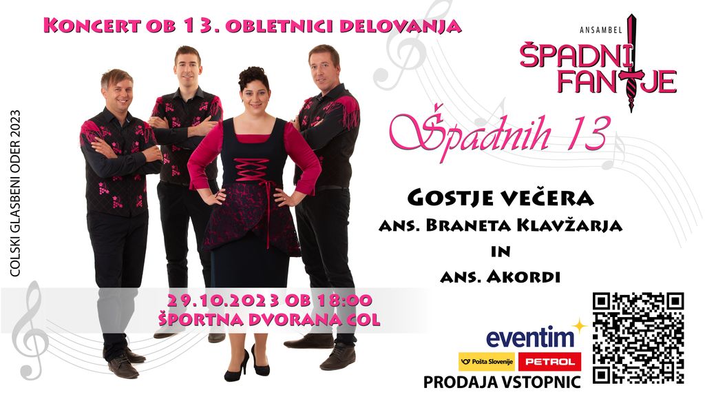 Vabljeni torej v nedeljo, 29. oktobra 2023 ob 18.00 v športno dvorano na Colu, da prisluhnete njihovim trinajstim letom in se z njimi poveselite. Na odru se jim bosta pridružila še ansambel Akordi in ansambel Braneta Klavžarja.
