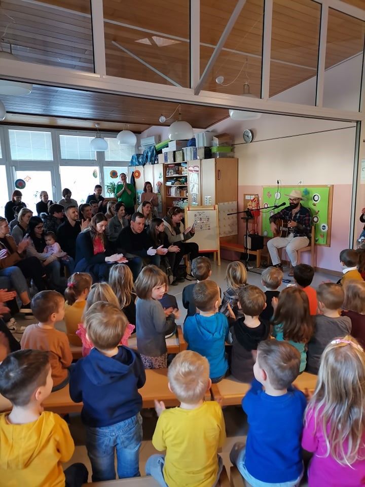 Ker smo jim obljubili glasbeno popoldne, je bil čas, da smo med nas pozdravili glasbenika, kantavtorja, pevca, kitarista in učitelja glasbe Boštjana Pertinača. Otroci so ga že spoznali, saj se je odzval našemu povabilu v prednovoletnem času. Boštjan nam je sam zaigral na kitaro in zapel nekaj svojih avtorskih pesmi in pesmi drugih glasbenikov, nato se mu je pri dveh pridružila še vzgojiteljica Melita Rožič. Za njima so bili na vrsti otroci. Vsaka skupina je zapela z vzgojitelji po eno pesem, na koncu pa še vse tri skupine (Beli, Rdeči in Vijolični) skupaj pesem Mamica moja. Ko se je skupno druženje zaključilo, smo starše in otroke povabili še v matične skupine na delavnice izdelovanja inštrumentov (ropotuljic in drdral).