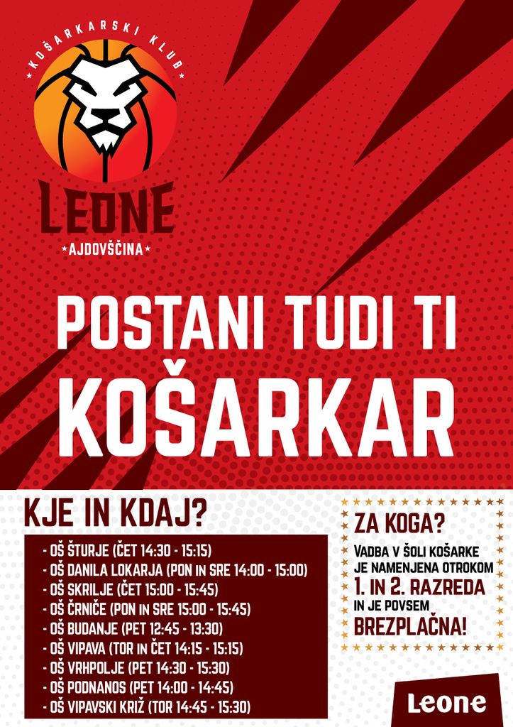 V zadnjih dveh tednih so trenerji Košarkarskega kluba Leone Ajdovščina na šolah v Ajdovščini, Vipavi in okoliških osnovnih in podružničnih šolah izvajali predstavitve košarke učencem od 1. do 4. razreda. Šola košarke bo tudi letos potekala na vseh šolah (OŠ Šturje, PŠ Budanje; OŠ Danila Lokarja; PŠ Skrilje, PŠ Črniče, PŠ Vipavski Križ; OŠ Vipava, PŠ Podnanos, PŠ Vrhpolje).