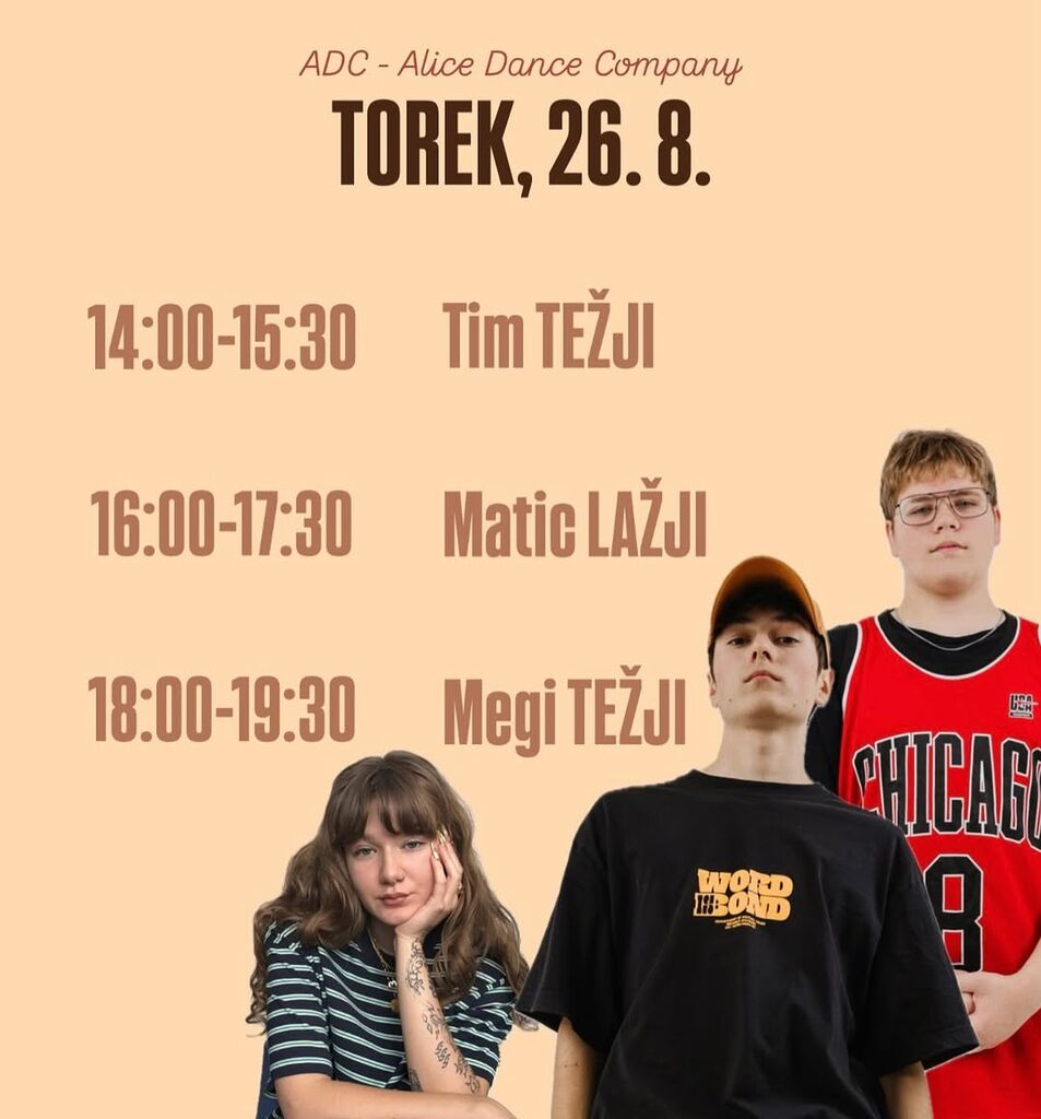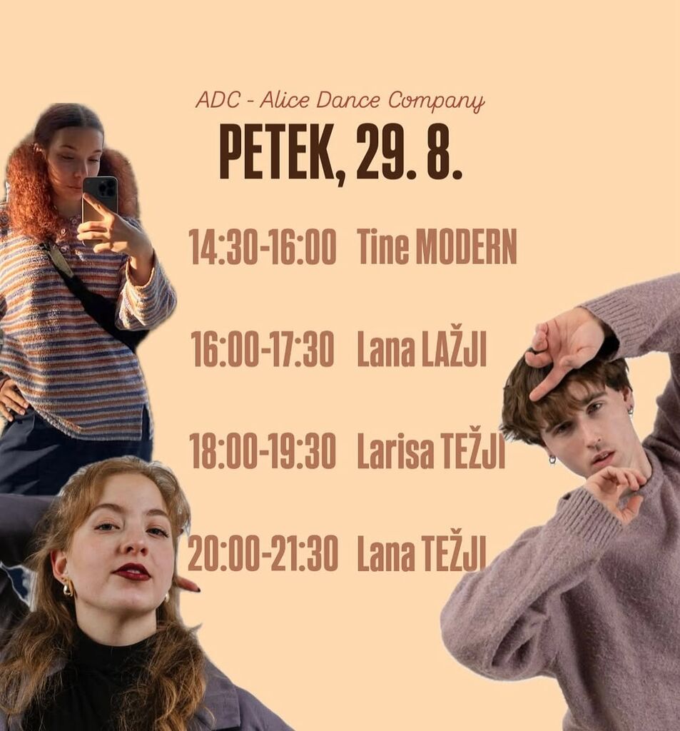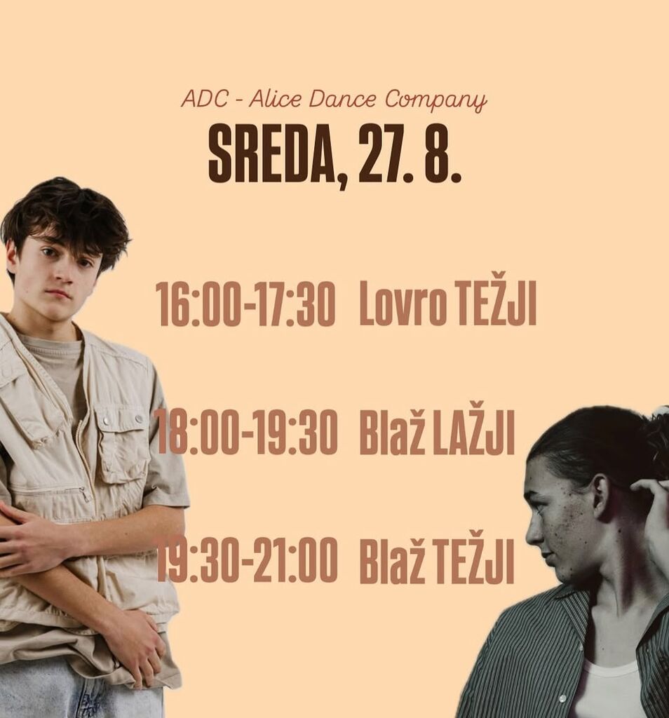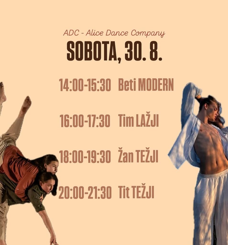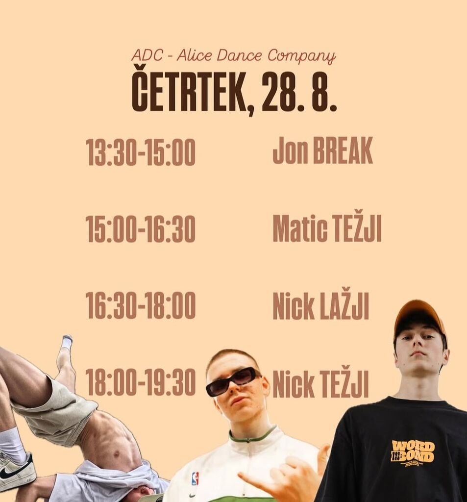 Vse info glede stilov in kaj od delavnice pričakovati bomo objavljali sproti na fb Plesni center ADC, Tik tok adc plesni center ter Instagram Alice dance company