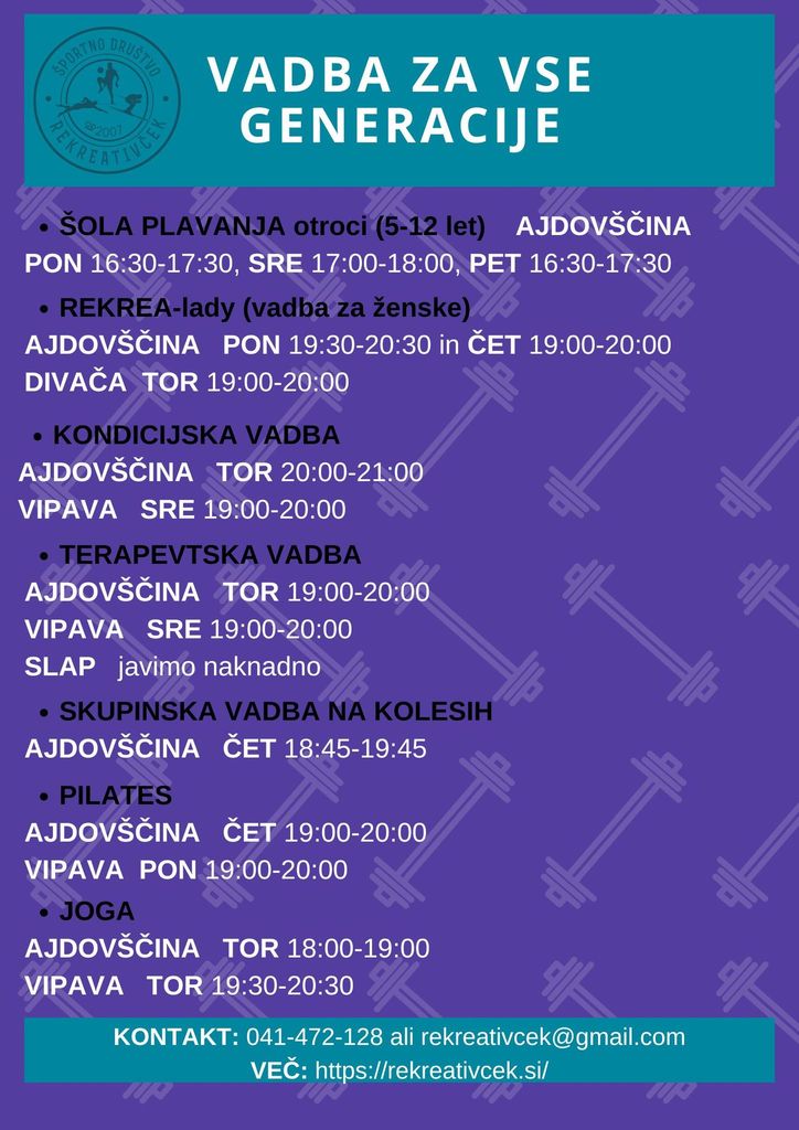 PRIJAVE: 041-472-128 ali rekreativcek@gmail.com