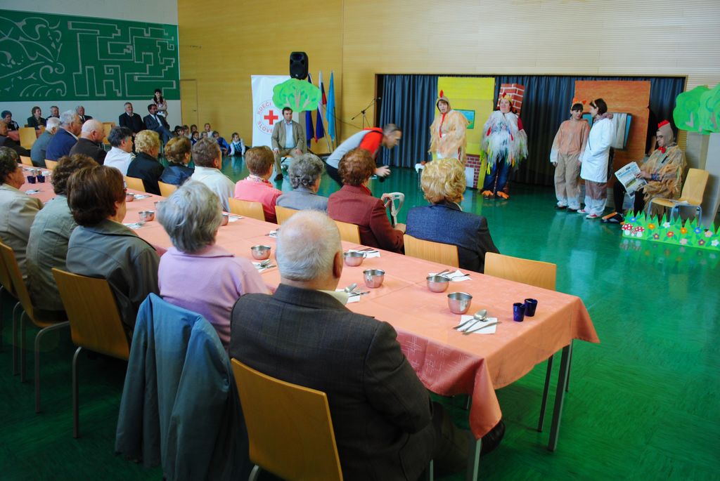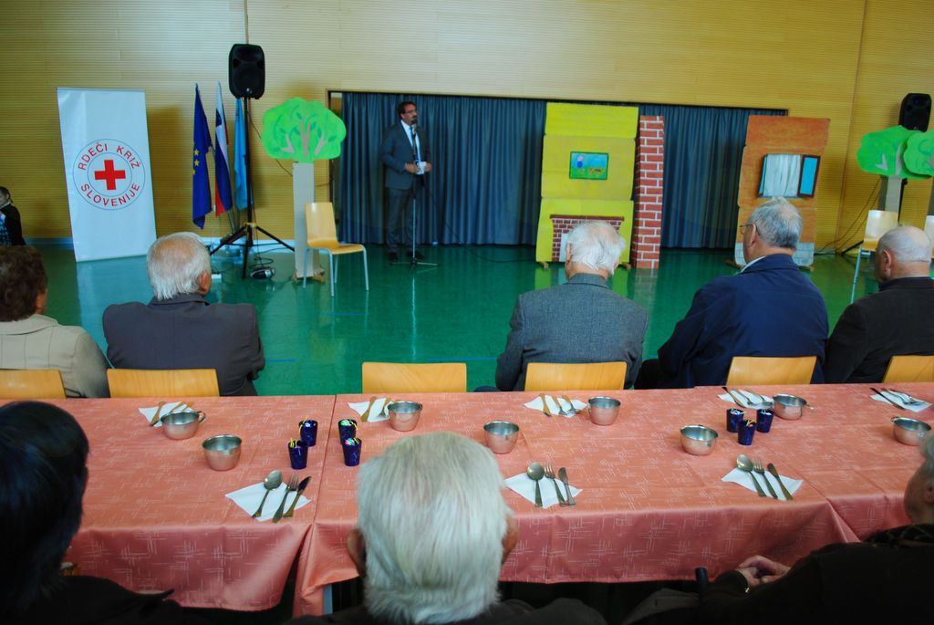 Srečanje je potekalo pod častnim pokroviteljstvom župana Občine Ajdovščina Tadeja Beočanina, ki je poudaril pomen aktivnega staranja in vključenosti starejših v družbo. Oba s predsednikom Rdečega križa Rajkom Troho sta približno 60 udeležencem uvodoma zaželela, da bi srečanje potekalo v prijetnem in sproščenem vzdušju. Zanj je poskrbelo več nastopajočih: zaplesala je folklorna skupina Osnovne šole Šturje; z igro Pujsa imamo za soseda je razmislek o predsodkih ponudila skupina Mali Holywood, ki deluje v okviru večgeneracijskega centra Ljudske univerze Ajdovščina in jo sestavljajo člani Šenta, Društva upokojencev Ajdovščina in učenke Osnovne šole Danila Lokarja; nastopil je moški pevski zbor Janez Svetokriški; Marinka Živec Lozar pa je recitirala pesmi, ki jih je zbrala v svoji pesniški zbirki Iskrice v besedah. Po zabavnem in kulturnem programu je sledilo druženje ob odličnem kosilu, ki so ga pripravili v šolski menzi. Srednji šoli Veno Pilon, ki že več let gosti srečanje, se za njeno gostoljubje iskreno zahvaljujemo. Prav tako se najlepše zahvaljujemo vsem nastopajočim in prostovoljcem, ki so pomagali pri izvedbi srečanja. Verjamemo, da bo druženje zbranim ostalo v lepem spominu, in upamo, da se prihodnje leto ponovno srečamo.