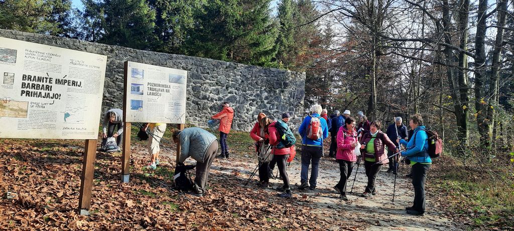 Peljali smo se po cesti čez Hrušico, mimo Stare pošte, zaselkov lepo urejenih hiš, samotne kmetije in gozdarske hiše ter pohod začeli po delčku logaške planinske poti. Našo pozornost sta pritegnili tabli ob poznorimski trdnjavi na Lanišču: „Branite imperij, Barbari prihajajo!“ Celoten obrambni sistem sicer ni obvaroval rimskega imperija, tudi naših korakov ni ustavil, še manj pa utišal sproščeno klepetanje. Res smo pot navkreber nadaljevali bolj počasi, vlažno listje je šelestelo in vrhovi vitkih smrek so skrivnostno bledeli v meglenih koprenah.