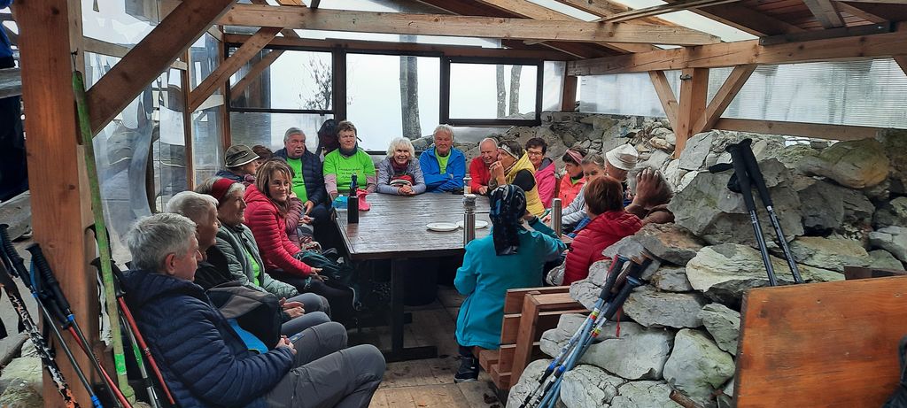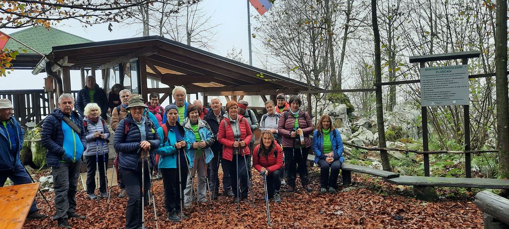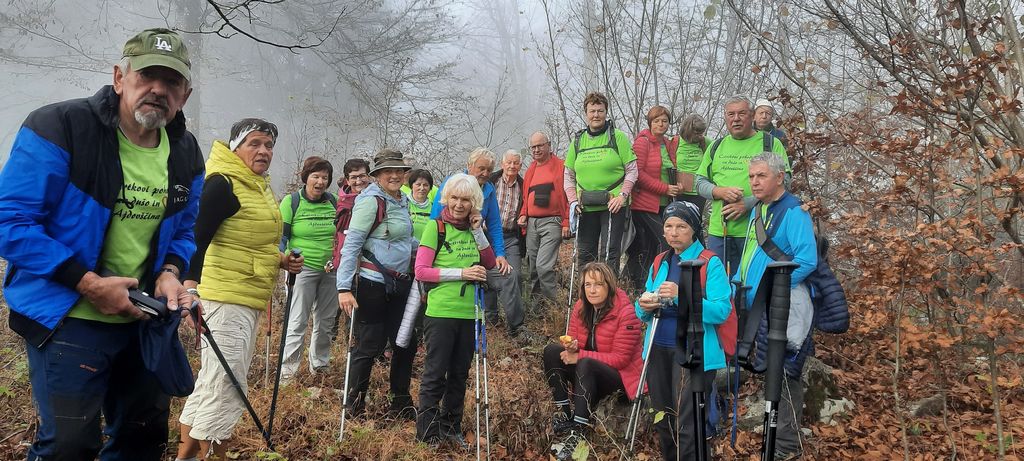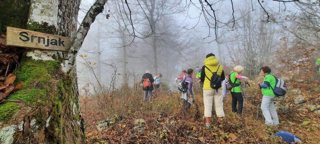 Prispeli smo na cesto, šli nekaj metrov po njej, nato pa desno in strmo po stezi meglenim zavesam naproti. Pot je bila dobro uhojena, previdnost za zaradi odpadlega listja zaželena in potrebna. Stopnice, vdelane v temno gozdno prst, so nas vodile do manjše ravnice. Iz megle so se izluščili obrisi, najprej smo mislil, da je kočica, pa se je izkazalo, da je to prostoren bivak - razgledišče, ki daje pohodnikom zavetje. Razgleda nismo ugledali, po ozki stezici smo se spustili do ceste, se po njej blago vzpenjali do križišča. Od tu naprej smo šli po kolovozu, ob robu poraslem s praprotjo in travami, med smrekami in golimi listavci ter sproščeno kramljali. Kmalu smo prišli na cilj, hrib Srnjak, označen s kamnitima blokoma. Po fotografiranju in ugibanju, čemu služi pozabljen lonec med kamni, smo se začeli spuščati po širokem kolovozu, posutim z listjem in polepšanim z rumenimi gobami. Vrnili smo se v slikovit bivak pod Srnjakom, se razporedili okrog miz in si kot vitezi kvadratnih miz vzeli čas za malico. Posladkali smo se s Frankovo odlično marmelado; za razgled nismo izgubljali časa, smo pa doživeli novembrski hlad. Premrzlih rok smo pohod nadaljevali po cesti in opazili strme škrapljaste skale, na katerih sloni bivak. Tudi za klopco ljubezni in zavetno kotanjo so graditelji bivaka tod našli dovolj prostora. Počasi so sončni žarki prebijali megle in odpiral se je razgled na logaško kotlino, predvsem pa smo bili veseli toplote sončnih žarkov.