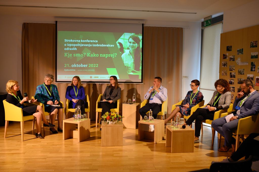 Sledila je izjemno zanimiva panelna razprava, preko katere so razpravljali o tem, kako naprej – kako v prihodnosti sistemsko spremljati in odgovarjati na potrebe po izpopolnjevanju izobraževalcev odraslih. V njej so ob moderiranju Tine Rožac (direktorica Ljudske univerze Koper) sodelovali odlični domači in tuji strokovnjaki s področja izobraževanja odraslih, predstavniki podjetij ter odločevalci: dr. Katarina Babnik (Filozofska fakulteta Univerze v Ljubljani), dr. Nataša Potočnik (Andragoški center Slovenije), mag. Bojan Hajdinjak (Zveza ljudskih univerz Slovenije), prof. dr. Ana Krajnc (Slovenska univerza za tretje življenjsko obdobje), Maruša Hauptman Železnik (Slovenske železnice, d. o. o.), Mario Vučić (Agencija za strokovno obrazovanje i obrazovanje odraslih, Hrvaška) ter Teja Dolgan (Ministrstvo za izobraževanje, znanost in šport).