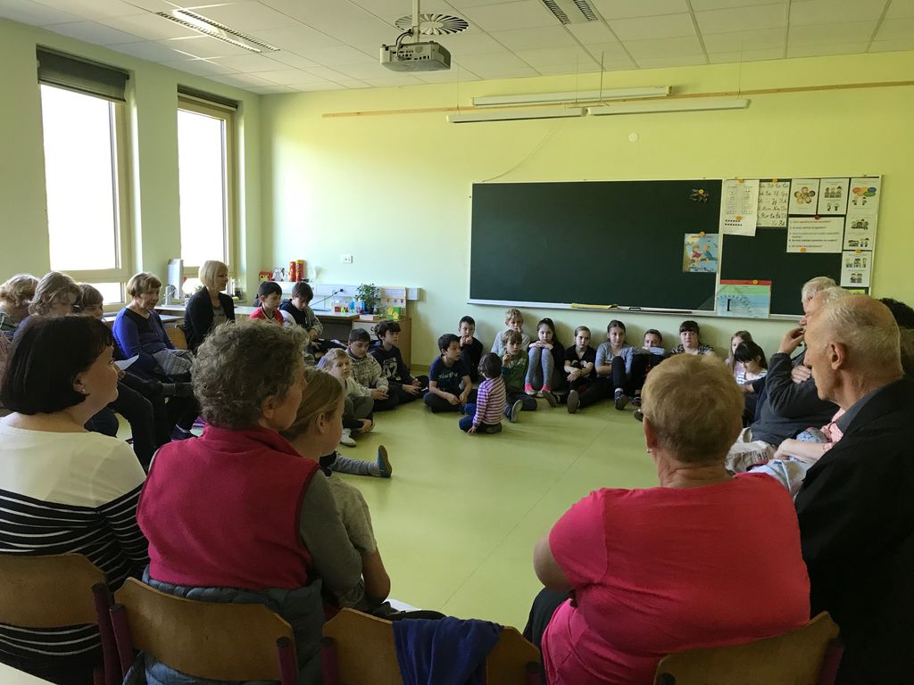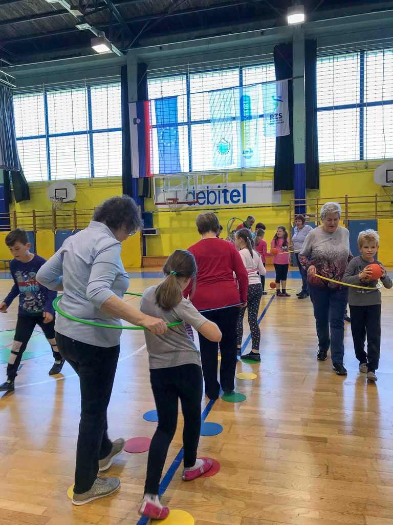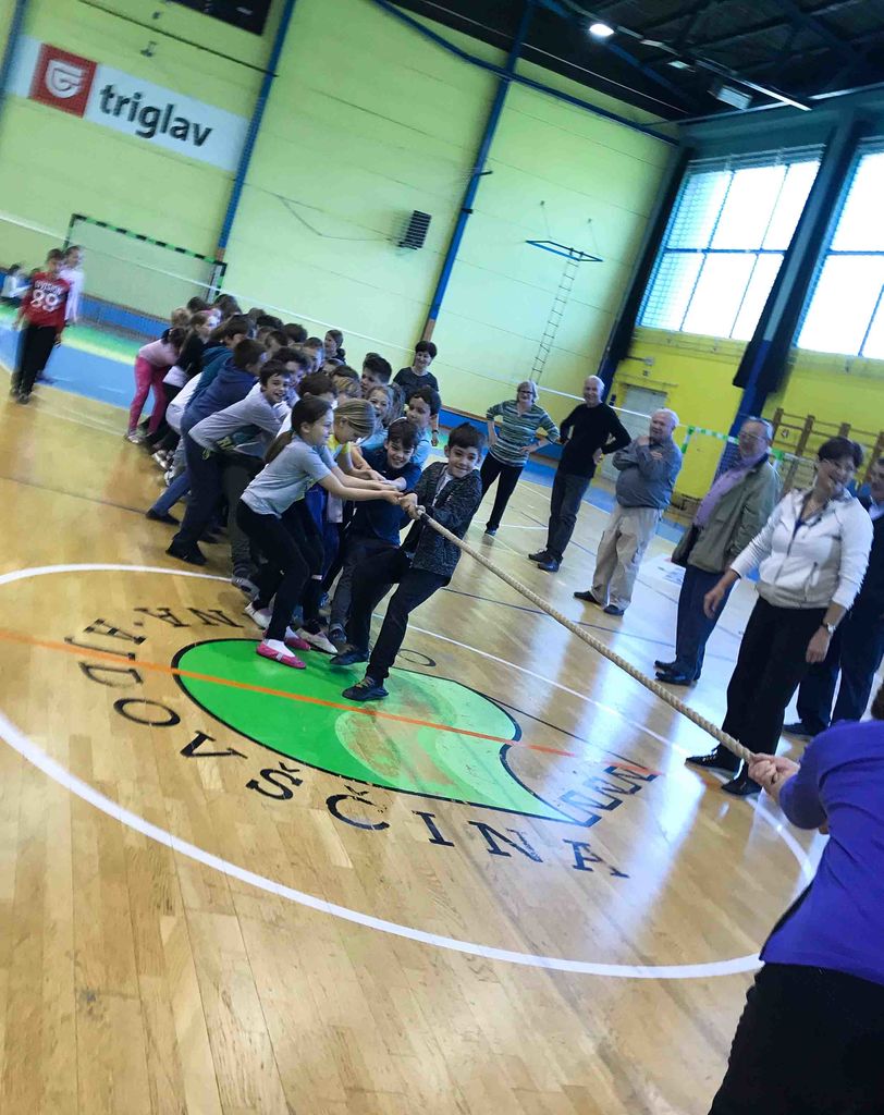 Četrtošolci pa so se s starimi starši že družili, in sicer pri uri športa in družbe. Najprej so se razgibali in se preizkusili v različnih igrah – v zbijanju kegljev, stožcev, badmintonu, slalomu med stožci, hoji z obroči ter slalomu z zavezanimi rokami ali nogami. Ob tem so vsi zelo uživali. Druženje so nadaljevali v učilnicah, kjer so stari starši učencem – vnukom pripovedovali, kakšno je bilo njihovo otroštvo, s čim so se igrali ter kako je bilo v časih, ko so sami hodili v šolo. Z velikim zanimanjem so prisluhnili vsem njihovim zgodbam. Učenci so ugotovili, da se njihovo otroštvo precej razlikuje od zdajšnjega. Živeli so veliko skromneje, a so bili vseeno srečni.