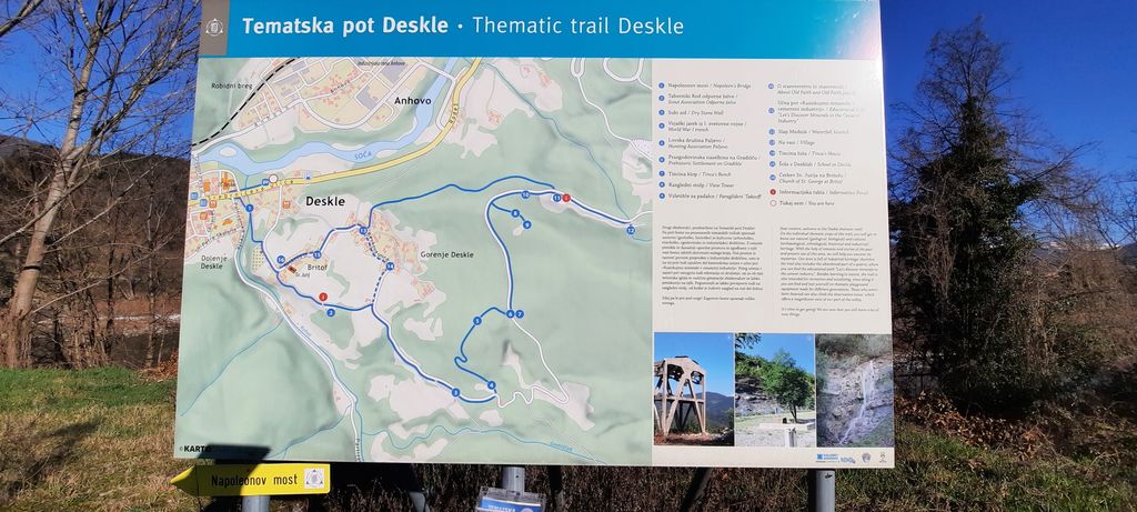 Če bi me pred nekaj dnevi nekdo povabil na izlet v Deskle, bi se le nasmehnila. Deskle, do pred nekaj urami zame zdolgočaseno naselje, z majhno bencinsko črpalko in kulturnim domom iz drugih časov, z nekakšnima blokoma, pa z azbestom posuto okolje, z razbrazdanim pobočjem zaradi kamnoloma … Ker pa Mirko in Marjana nista kdorkoli, smo se četrtkovi pohodniki podali po Soški dolini do Deskel. S parkiranjem tokrat ni bilo težav, pano na parkirišču nas je vabil na tematsko pot, ki so jo uredili 2021. leta ob stoletnici cementarne. Darilo domačinom kot odkupnina za vse težave, ki jih je industrializacija prinesla v te kraje.