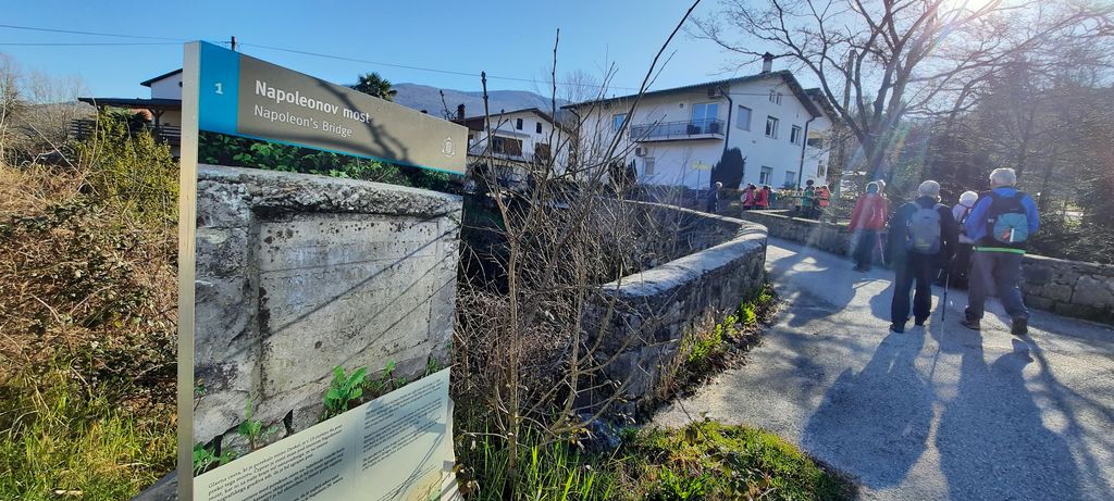 Še v prijetnem hladu smo prišli najprej do Napoleonovega mostu. Na tabli smo prebrali, da so most zgradili že pred Napoleonom, je pa to verjetno edini most v Soški dolini, čez katerega je francoski cesar resnično šel proti Koroški.