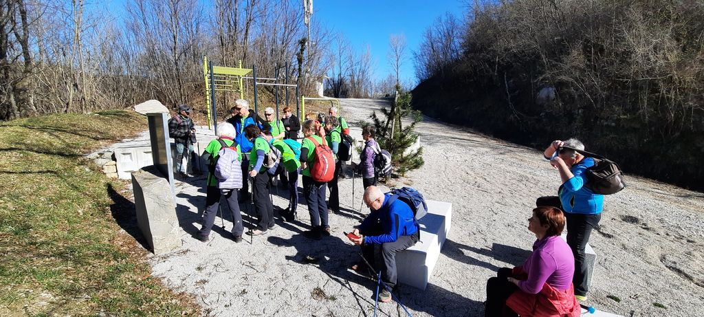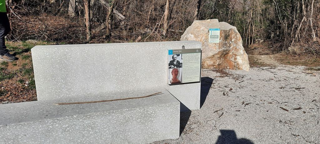 Pot skozi redek gozd se blago vzpenja in dokaj hitro smo prišli do naslednje table, vsebino so prispevali lovci lovske družine Paljevo, da bi predstavili prizadevanja za varstvo narave in izboljšanje življenjskega prostora za živali in rastline. Tudi za iskalce sledi so pripravili slike živali in njihovih sledi. Mi le-teh nismo iskali, raje smo se ustavili ob Tincini klopi, domačinki Katarini Marinič, ki je doslej najstarejša Slovenka. Skromno je živela v dveh tisočletjih, v treh stoletjih, v petih državah, nekaj let kot begunka, tri desetletja kot vdova v domači hiši v Desklah, vedno vesela in dobrodušna in zadovoljna. V spomin nanjo so postavili klopco na kraju prazgodovinske naselbine ne Gradišču. Tu naj bi, po ljudskem izročilu, nekoč stala tudi cerkev svetega Lovrenca. Nadaljevanje poti je vabilo najbolj vitalne med nami, da so preizkusili moči in ravnotežje na telovadnih napravah. V opomin smo brali besedilo o društvu obolelih zaradi azbestoze. Po strmi gruščnati poti smo prišli do razglednega stolpa, nekdaj podpornega stebra žičnice za prevoz laporja do cementarne. Tu se nam je odprl razgled na vse strani od zasneženih Julijcev, preko zahodnega hribovja in navzdol po Soški dolini. V prijetni toploti sončnih žarkov smo imeli čas za malico in sproščeno kramljanje.
