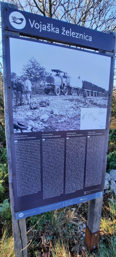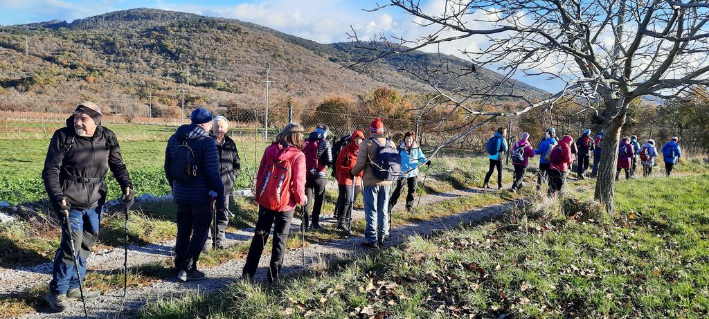 Prve korake smo ubirali po cesti, a kmalu zavili na široko stezo. Šelestenje kostanjevih listov in prijetna pot skozi redek gozdiček sta pripomogla k odličnemu razpoloženju pohodnikov. Kmalu smo prečkali cesto in nadaljevali po travnikih pod Trsteljem, kjer se počasi celijo rane obsežnega požara pred dvema letoma. Po Poti miru smo šli čez travnik Ranko do vojaškega pokopališča iz prve svetovne vojne. Svoj mir, v varstvu visoke kamnite piramide, je tu našlo več kot dvesto avstroogrskih in štirideset italijanskih vojakov, ki so jih kasneje prekopali, ter trije ruski ujetniki. Po krajšem razmisleku o nesmiselnosti vojn smo prišli do vasi Lipa. Vas je med 1. sv. vojno ostala skoraj nepoškodovana, zato se je v njej ohranilo največ kraške arhitekture s številnimi kamnoseškimi izdelki. Opazili smo tudi nove hiše in si ob novogradnji vzeli čas za malico, prijetno klepetanje in vesel smeh ob šalah, ki smo se jih spomnili. Pohod smo nato nadaljevali po markirani makadamski poti, ki nas je vodila globoko v dolino Dolnjak. Po dobrem kilometru smo ugledali kažipot, ki označuje Pot miru in vodi po trasi nekdanje železnice iz Dutovelj do Kostanjevice. Na tabli smo prebrali, da so traso določili v slabem mesecu 1915. leta, progo pa so zgradili v mesecu in pol – za današnji čas je to nepredstavljivo. Po njej so vozili vlaki, ki jih je skonstruiral Ferdinand Porsche. Kljub naglici je bila gradnja zelo solidna, saj je kamniti nasip še danes zelo trden. Žal je nepremišljenost ali še kaj hujšega, spodbudila ljudi, da so progo razdrli. „Nič ni bolj nesmiselno kot učinkovita izvedba tistega, kar sploh ne bi bilo potrebno izvesti.“ (Peter Drucker).