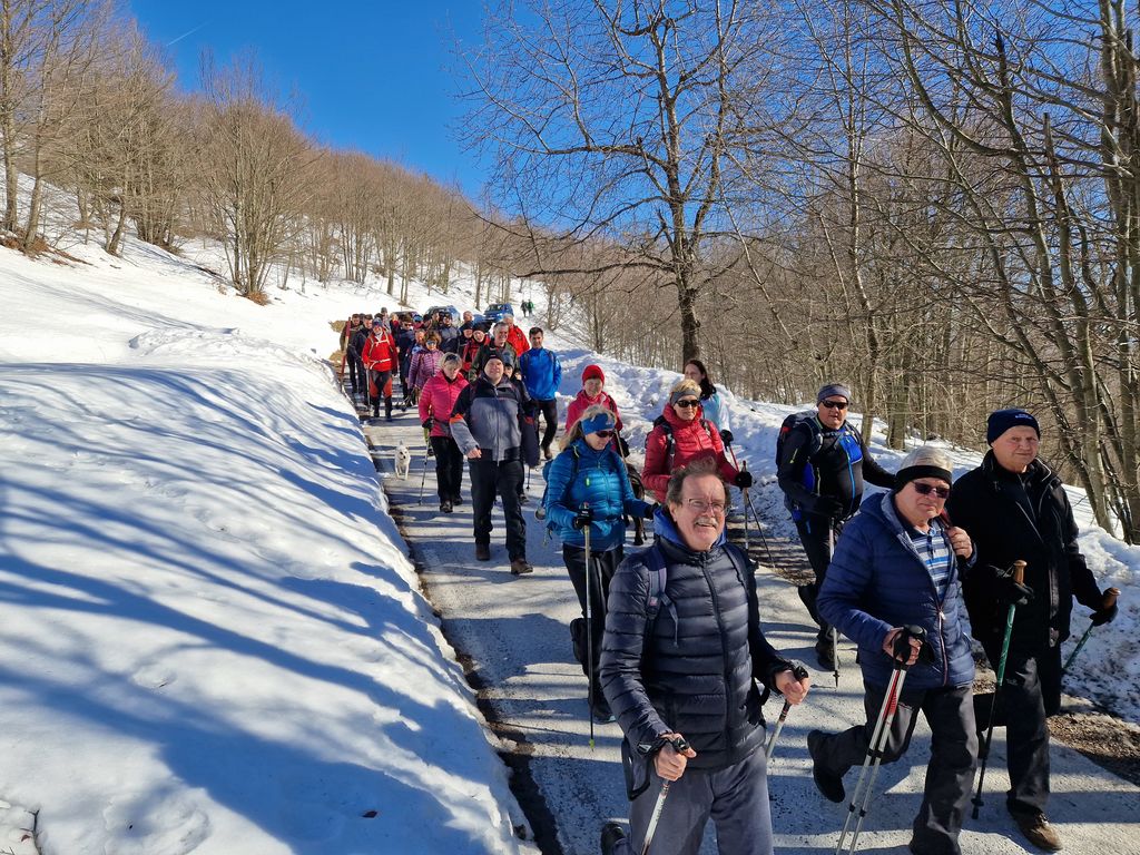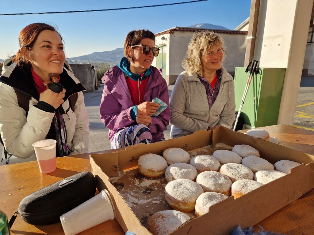Na povratku v dolino smo ob izredno lepem vremenu, stezo nekoliko spremenili, tako da smo po poti nekaj članov izgubili … Uspešno smo prispeli pred dom krajanov v Žapuže, ker so nas čakali krofi kot nagrada za uspešen pohod.
