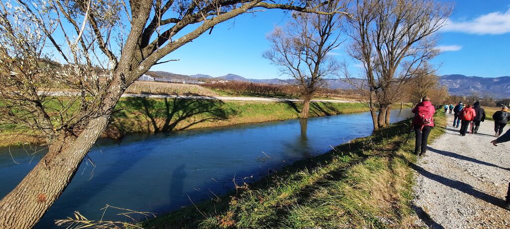 Pot ob reki Vipavi je ravninska, občasno se umakne reki in spet vrne. Nudi čudovite razglede na pogorje Čavna, Sinjega vrha in Nanosa, od Sabotina do Škabrijela, na južno stran na Črne hribe do Cerja, v daljavi so se pokazali tudi beli Dolomiti. V dobrih dveh urah smo v družbi 34 četrtkovih pohodnikov končali pohod za dušo in srce.