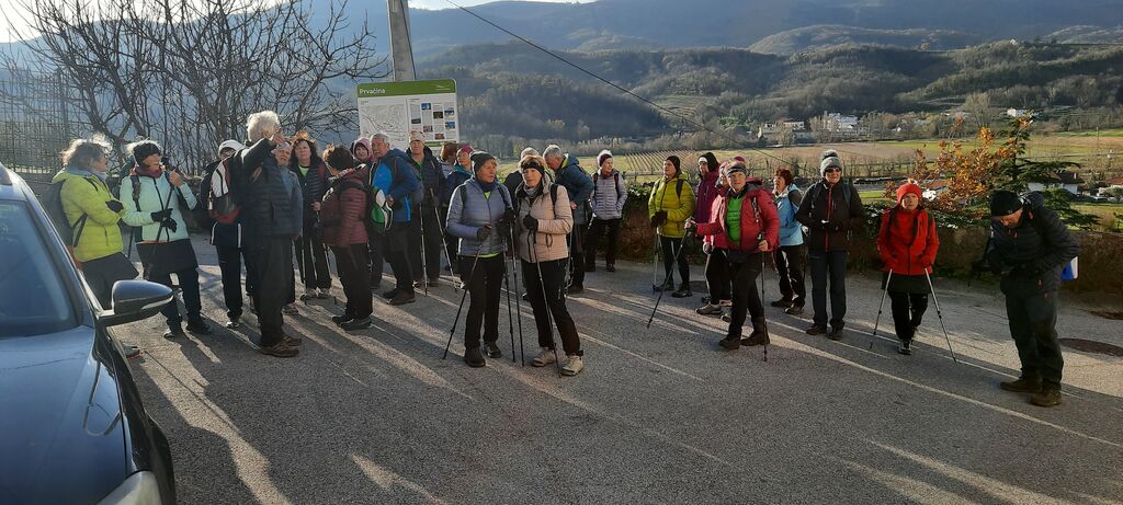 V mrzlem in vetrovnem četrtkovem jutru smo se hitro razporedili v avtomobile in se odpeljali na železniško postajo v Volčjo Drago. Točno ob uri je prisopihal vlak. Vožnja do Dornberka je trajala le nekaj minut. S postaje smo šli na sprehajalno in kolesarsko tematsko učno pot, ki povezuje vse občine v Vipavski dolini. Vodi od izvira v Vipavi do Mirna, nadaljuje pa se še na italijansko stran do izliva reke Soče. Celotna pot je dolga 46 kilometrov. Četrtkovi pohodniki smo, glede na našo zmogljivost, izbrali le del poti v dolžini osem kilometrov, od Dornberka do Volčje Drage. Pot so nam kazale usmerjevalne tablice na količkih z logotipom vidre. V Dornberku smo se usmerili na makadamsko stezo ob železniških tirih, jih kmalu prečkali, nato čez manjši mostiček in mimo razpadajočega vodnega stolpa, ki je nekoč služil za hlajenje parnih lokomotiv. Kmalu smo prispeli v Prvačino, razloženo naselje, ki leži na sončni vzpetini nad reko Vipavo. Je tudi kraj z mnogimi znamenitostmi. Na ovinku za vojaškim pokopališčem iz prve svetovne vojne smo po manjšem, tudi edinem vzponu na pohodu, šli po znamenitem drevoredu platan do starega vaškega jedra, kjer stoji cerkev sv. Andreja in hiša Aleksandrink.