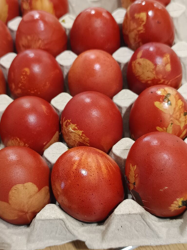 Jajčka so krasili po tradicionalnem postopku z naravnimi rožicami in travicami ter kuhanjem v čebulnih olupkih. Nastajali so res čudoviti vzorci, še lepši pa so bili trenutki vmes. Ob vprašanju »A bo šlo?«, je hitro prišel nasmejan odgovor: »Ah, kaj ne bi šlo, koliko takih sem že naredila v življenju!«