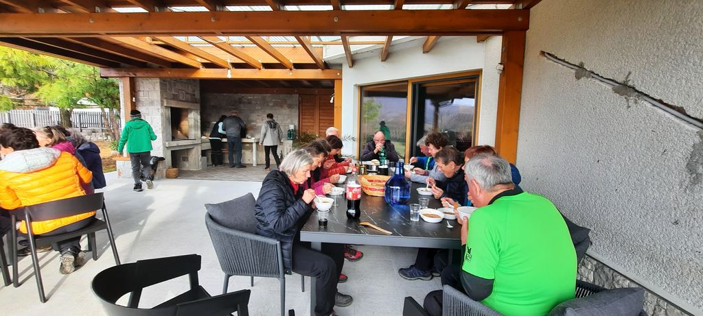 V Ajdovščini nas je pričakal tretji B – tudi Niko Bajc, tokrat oče. Z odličnim pasuljem nas je ogrel in navdušil. Res se je skrbno pripravil na ta četrtek, saj je že dan prej skuhal vsaj šest kilogramov fižola. Za vprašanja, kako je jokal ob sekljanju kilogramov čebule, ni bilo časa, Mirko nam je povedal povzetek letošnjega leta, daljših in krajših pohodov. Morda je celo upal, da mu bomo prihodnji četrtek privoščili počitnice, pa smo ga pregovorili za pohod v Vipavski Križ.