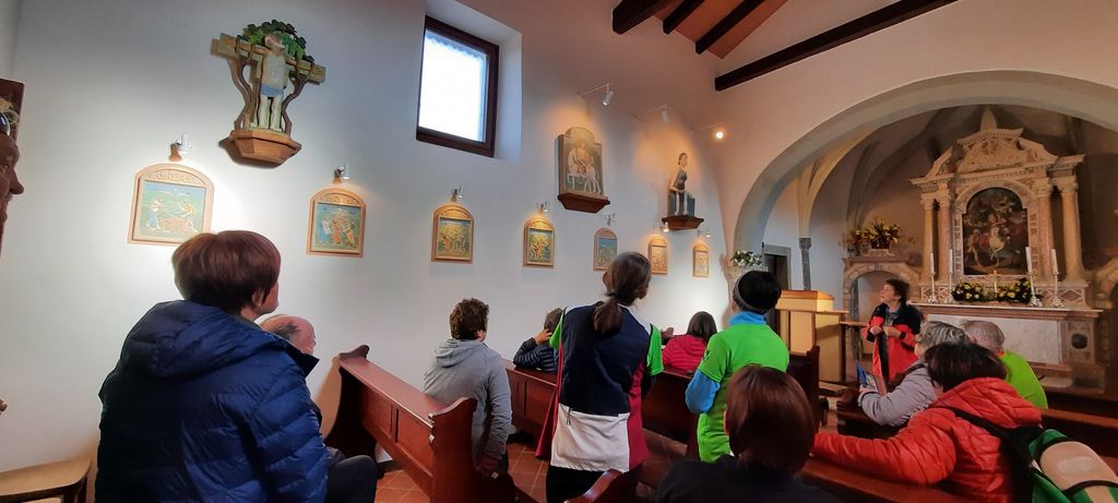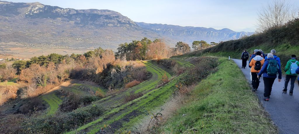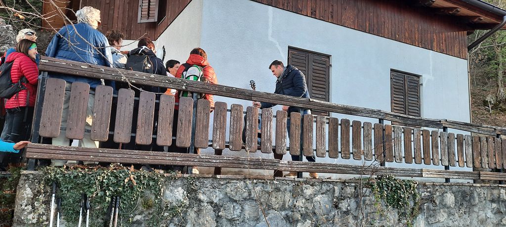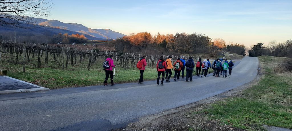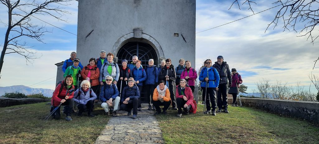 Ob poti pri vinogradu sta nas nagajivo gledala lesena srnica in srnjaček v družbi kar treh božičkov. Mirno sta stala, ko smo se jima namuznili, saj gotovo nista povzročila nobene škode v bližnjem vinogradu. V nič kaj božičnem vremenu sta nas na bližnje praznike spomnila pohleven osliček in miren bikec, oba lesena. Tiho sta stala pod verigo lučk v obrisu družine in se prepustila fotografiranju. Že ob naslednjem dvorišču smo ugotovili, da bomo domov prinesli 'polno mauho' = pomnilnikov v mobitelih, s fotografijami in polno glavo zamisli za praznične okrasitve. Videli smo še skrbno obnovljene hiše, šli skozi Pečenkove do table za oljčno pot in smerokaza za Triglovc. Kje je to, nismo ugotovili, smo pa s ceste zavili na širok kolovoz, sočna zelena trava je ublažila stopinje in počasi smo dosegli cesto na vrhu grebena. Hoja po položni cesti je dovoljevala raznovrstno klepetanje, ja, od kuharskih do zeliščarskih, zdravstvenih in popotniških tem obdelamo na četrtkovih pohodih. »Ni dobro biti človeku sam,« zato se družimo. Tako vzamemo vsak teden obilen odmerek zdravila za dušo, za telo poskrbimo med gibanjem. In to nas je privedlo do nove lovske koče. Belo obmetana stavba nas ni nagovorila, zanimanje pa je pritegnila dolga lesena stavba nad cesto, predvsem pa v zemljen breg potisnjen star motor. To smo si morali ogledati, to je domicil za lastnike starodobnih motorjev. Na peščeni ravnici pred stavbo so bile vidne krožne sledi motoristov, nas pa je prevzel prelep razgled na Vipavsko dolino in številna naselja od Vipavskega Križa, Dobravelj, Skrilj, Kamenj do Vrtovina in še dalje proti Škabrijelu, Sveti Gori do Korade. V prosojnem zraku smo zaslutili obris Matajurja in tam daleč, daleč meglice nad Furlansko nižino. Pohod smo nadaljevali najprej malo navzdol, nato pa skozi vinograd do primorskega gozdiča. Suho kostanjevo listje je šumelo, ko smo prihajali do lične hiše v varstvu mogočne skale in drevja. Tu nas je res gostoljubno sprejel drugi B. S požirkom krepkega smo si ogreli grla in se sladkali z janeževimi upognjenci in suhim ananasom. Niko Bajc mlajši, drugi B, nam je podaril še obilno mero zdravila za dušo, ko je vzel kitaro in zapel. Marsikateri so se orosile oči ob pesmi Mama, hvala, slišali smo tudi prvo uglasbeno pesem o naši burji. To srečanje nas je tako prevzelo, da smo spregledali naslednji smerokaz in jo ubrali kar počez in navzgor proti cerkvi svetega Martina. Mirko in Tea sta čistila grmovje in suha debla pred nami, z lezenjem čez kamne in skozi šibe smo dokazali, da složno zmoremo premagovati ovire na poteh. Zadovoljni smo prišli do cerkvice, ki spada v braniško faro. Prijazna domačinka nam jo je odprla in povedala, da stavba izvira iz Trubarjevih časov. Med drugo svetovno vojno so Italijani porušili zvonik, po vojni je do leta 1991 cerkvica propadala. Ko so jo obnovili, je mimo prišel znani umetnik Peter Černe in jo enovito opremil s keramičnimi skulpturami in reliefi mrtvaškega plesa in križevega pota. Predstavila nam je pomen teh umetnin; no, če boste šli mimo, le poiščite gospo, ki vam bo rade volje vse povedala. Obisk kraja je vreden tudi zaradi razgleda: na eni strani sončna Vipavska dolina z obronki Nanosa in Trnovskega gozda, na drugi strani Branik z mogočnim gradom in kraškim gričevjem. Vračali smo se po cesti, šli mimo obnovljenega kala, iskali Jamo Gama, zavili še v Cinke in nato zaključili krožno pot.