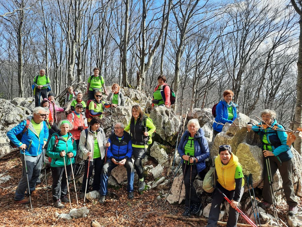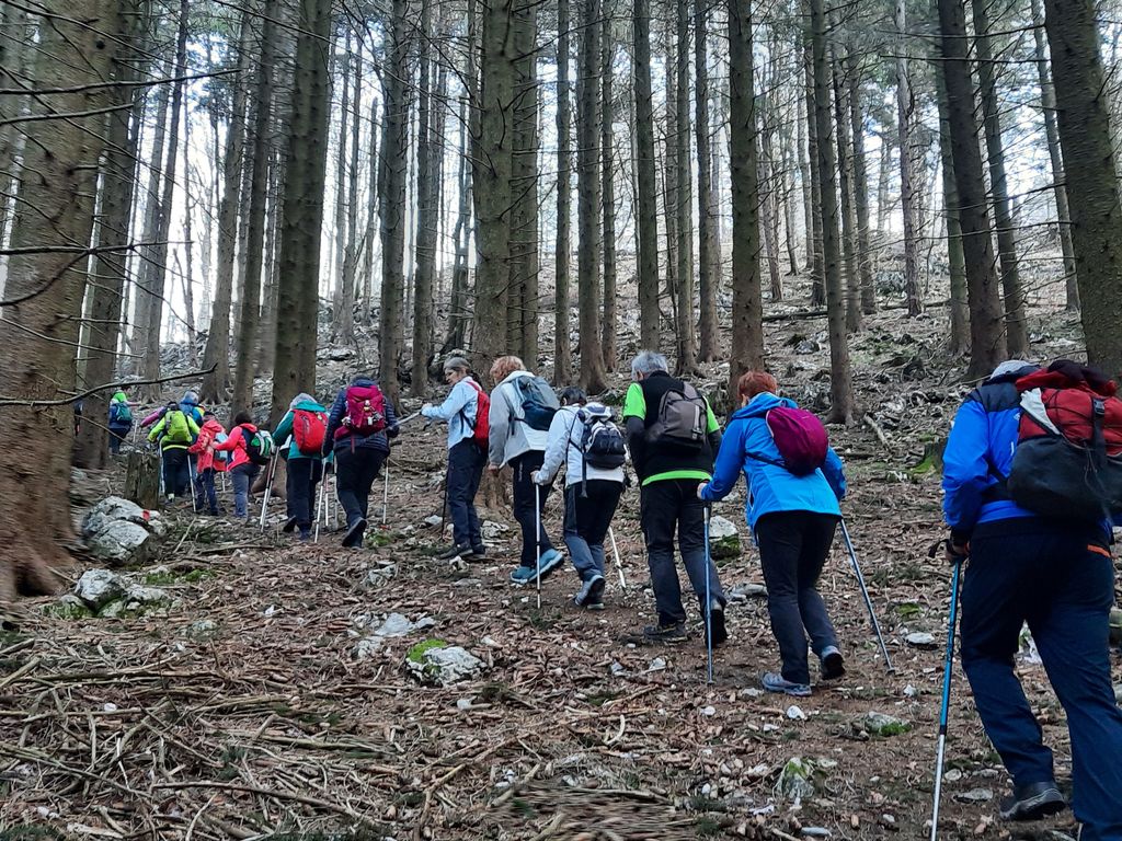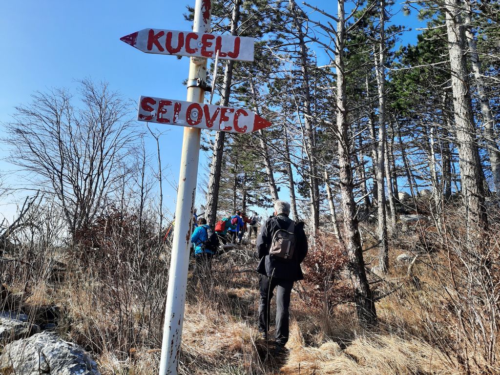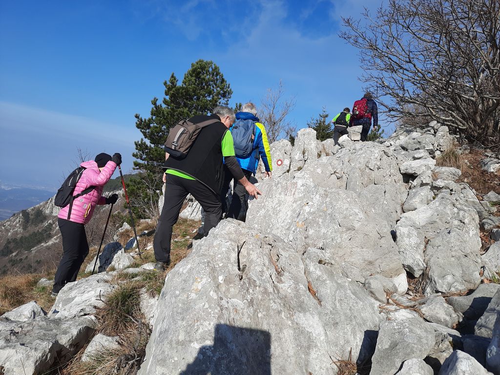 Na Selovcu smo začeli našo pešpot. Najprej po cesti, da smo nastavili višino pohodnih palic, merilne naprave na telefonih, predvsem pa se nadihali svežega zraka. Ob božanju sončnih žarkov smo šli po kamniti široki poti do prvega smerokaza, ki nas je usmeril na ozko in dokaj strmo stezo proti Velikemu robu. Strmina nam ni vzela sape in smo še malo pogodrnjali nad odnosom do naše ljube Zemlje in njenih prebivalcev. Kmalu smo se dotaknili tudi dobrih zlatih časov, ko smo na kamnu ugledali oznako za nekdanjo mejo med privatnimi in državnimi gozdovi, ja, stara Avstrija je imela to urejeno … Iz modrovanja nas je prebudil hladen piš, ki je vel po robu, ugledali smo skalne pečine in varno stopali med koreninami in kamni. Pa je kmalu prišla sprostitev, ko je pot zavila v gozd. Razsute iglice in vlažna zemlja so utišali korake, oči smo spočili med debli mogočnih borovcev – darilo za dušo. Kmalu pa smo delali tudi za telo, ko smo prišli iz zavetja gozda, smo že ugledali kamniti vrh in križ na Velikem robu. Še nekaj pozornosti in vzpon smo premagali in že smo si ogledavali kraje od Gorice, preko Krasa do Nanosa, Modrasovca, Mrzlega roba, velike gole zaplate, ki jo bodo prostovoljci še ta mesec pogozdovali, … ; po sodobno bi rekli: vrtljiva kamera za 360° - rahlo zamegljene daljave niso bile ovira. Vzeli smo si čas za malico.