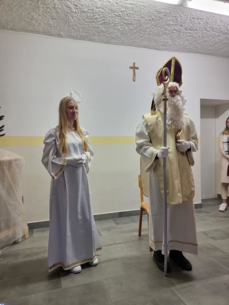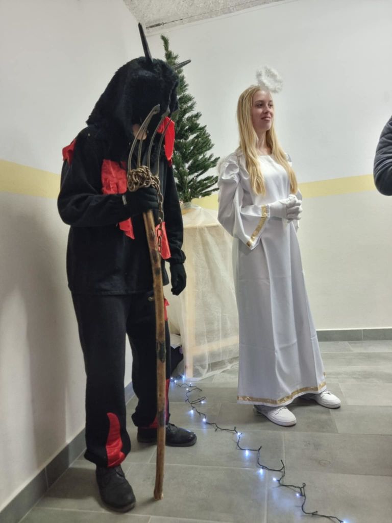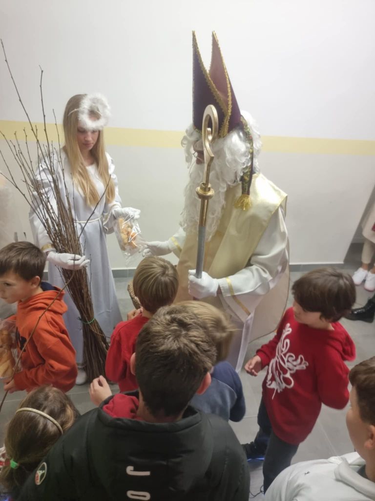 Večer glasbe in pesmi se je stopnjeval do prihoda svetega Miklavža. Prišel je v spremstvu parkeljna in angela. Miklavž je pohvalil otroke za njihovo lepo vedenje in jih povabil k molitvi. Parkelj pa se je ustrašil molitve, spustil šibe in zbežal iz dvorane. Potem sta Miklavž in angel razdelila darila in šibe vsem otrokom v dvorani.