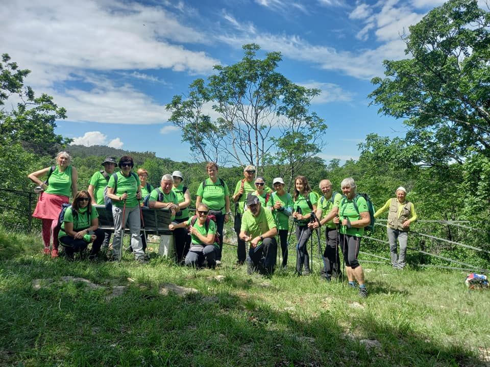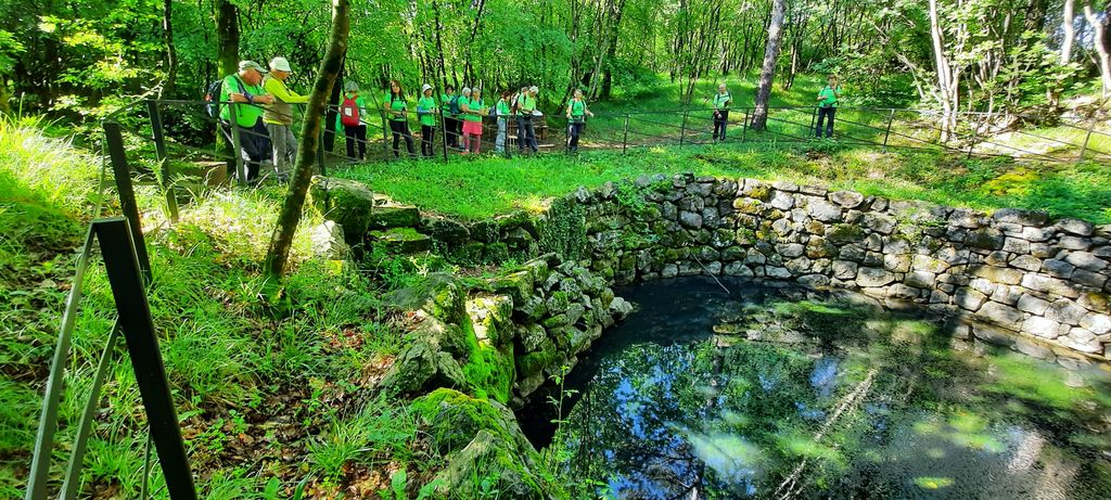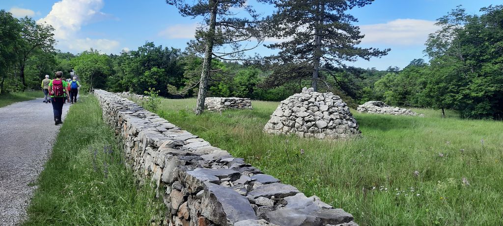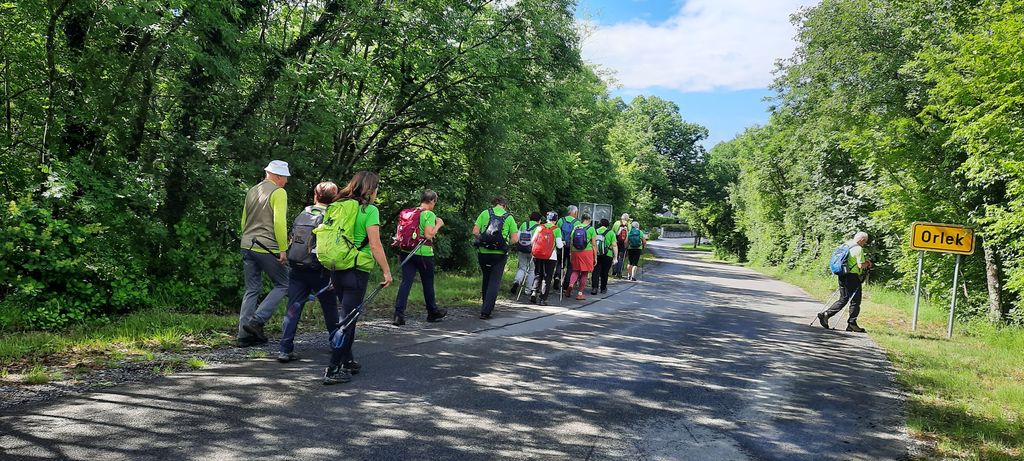 Četrtkovi pohodniki smo pot začeli na za to urejenem parkirišču malo izven Sežane. Ob vhodu v muzej smo si ogledali informativno tablo poti, zavili desno po ozki stezi s travo, s katere smo pobrali jutranjo roso. Prišli smo do prve kraške znamenitosti: Nova štirna. Spada med redke ohranjene štirne sredi gmajne. Prebivalci so vložili veliko naporov, da se je v njej nabirala deževnica, ki si jo uporabljali za pitje. Štirna je okrogle oblike, premera devet, globine pa tri metre in je bložena s kamni. Vrnili smo se na cesto, ob kateri je v gradnji suhozidje, posebnost Krasa, ki daje značilnost in estetiko kraški krajini, na travniku pa je nekaj znamenitih kamnitih pastirskih hišk. Kmalu nas je smerna tabla pripeljala k Ludvikovi jami, v kateri so bile odkrite fosilne kosti velike kune. Po asfaltni cesti smo pot nadaljevali skoz vas Orlek. Na vaškem balinišču smo posedli po klopcah in zidkih in se okrepčali z dobrotami iz nahrbtnika. V križišču vasi smo prešli na kolovoz in mimo kala pri Orleku, ki je zaraščen s travo, v preteklosti pa je služil za napajanje živine.