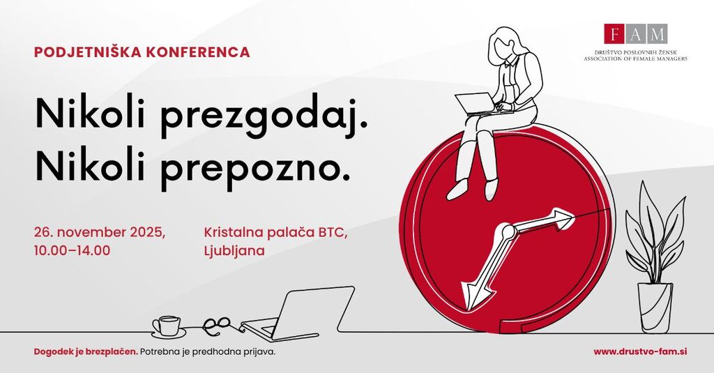 Kdaj je pravi čas za prvi podjetniški korak? Ko si star 25 in poln idej? Ali morda pri 50-ih, ko končno razumeš, kaj te zares veseli? Odgovor je preprost: nikoli ni prezgodaj, nikoli ni prepozno. Prav to sporočilo bo v središču 3. podjetniške konference Društva poslovnih žensk FAM, ki bo letos potekala pod geslom: “Nikoli prezgodaj. Nikoli prepozno – za nov podjetniški začetek. Za preobrat. Za pogum.”