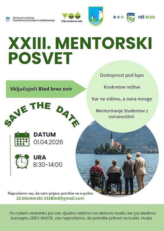 Kotizacija: 50 EUR. Svoje mesto na posvetu si do najkasneje 27. 3. zagotovite s pošiljanjem potrdila o udeležbi na: 23.Mentorski.VSSBled@gmail.com.