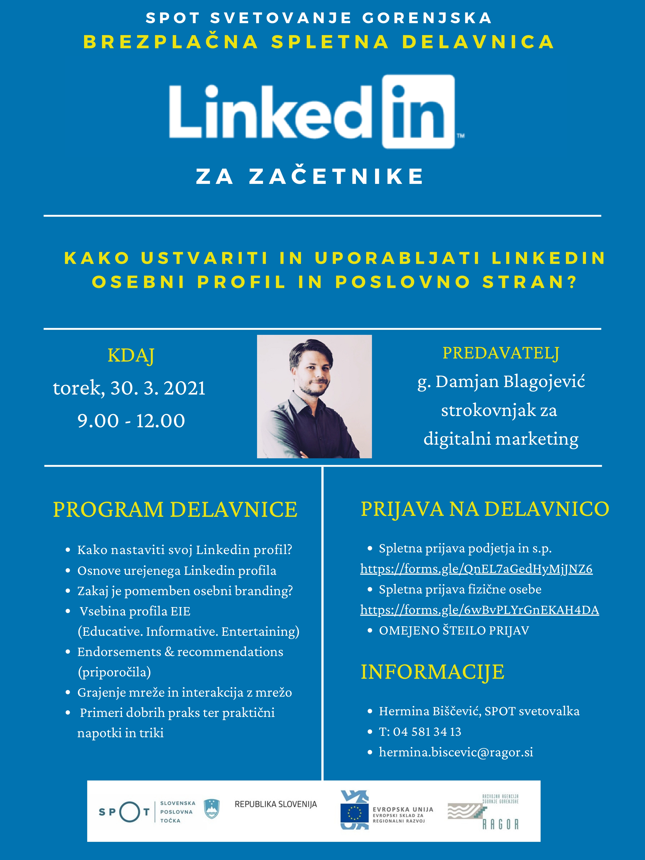 Razvojna agencija Zgornje Gorenjske v okviru SPOT svetovanje Gorenjska vabi na brezplačno spletno delavnico z naslovom »KAKO USTVARITI IN UPORABLJATI LINKEDIN OSEBNI PROFIL IN POSLOVNO STRAN« – Linkedin za začetnike
