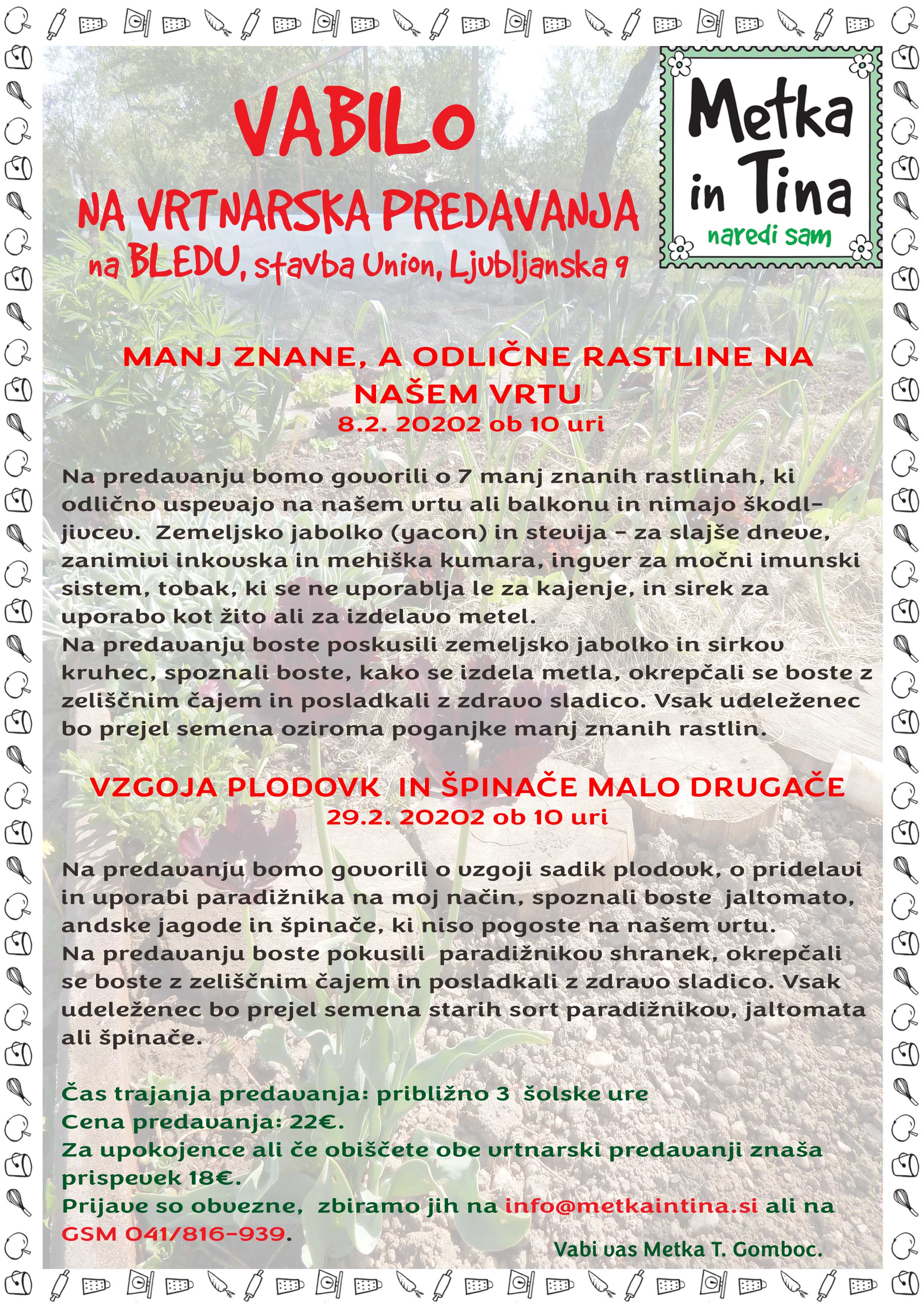 Prijave so obvezne, zbiramo jih na info@metkaintina.si ali na 041/816-939.