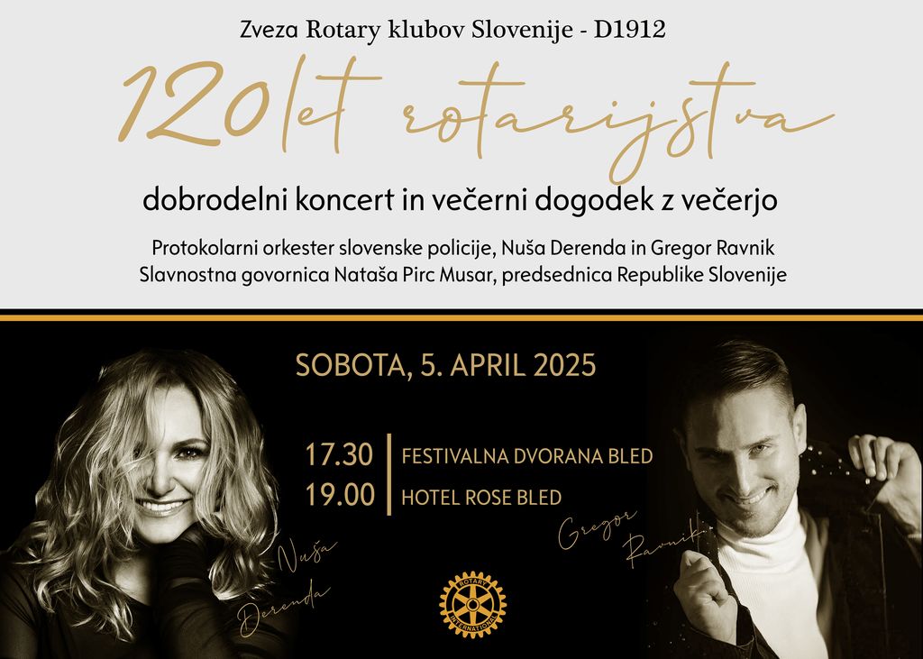 Zveza Rotary klubov Slovenije vabi na dobrodelni koncert, ki bo potekal v soboto, 5. aprila 2025, ob 17.30 uri v Festivalni dvorani na Bledu. Pridružite se nam na večeru vrhunske glasbe in dobrodelnosti, kjer bomo skupaj podprli projekte za mlade.